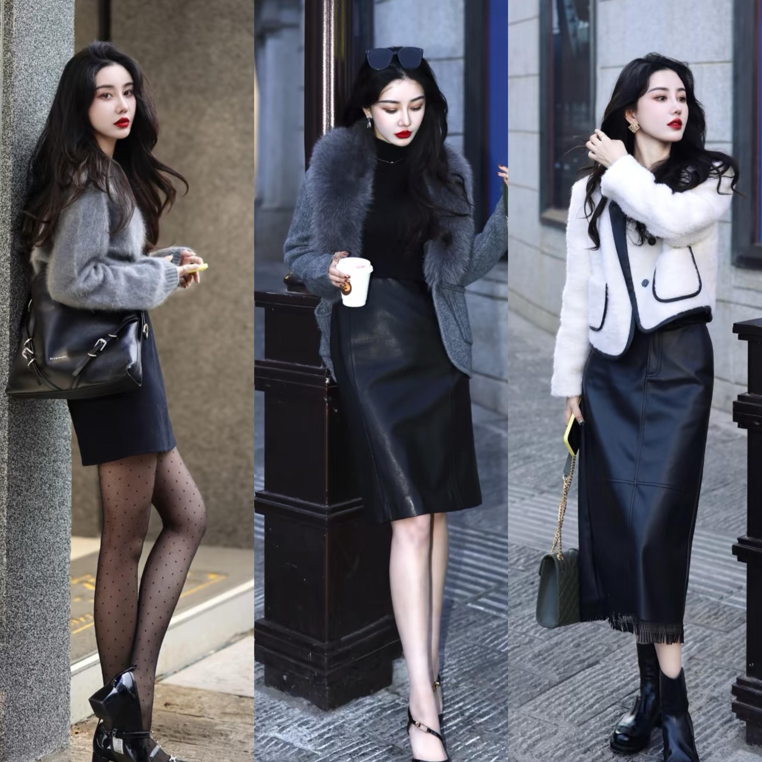 比如高級感的羊絨外套,搭配半身皮裙,就是又颯又美。半身皮裙配黑色短靴,既高級又大方,這種組合太惹眼了,時髦醒目格外顯貴。