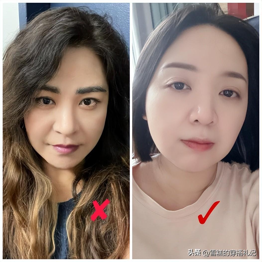 從上面的長髮和短髮的對比圖就可以看出,左邊是長髮的造型,顯得整個人有點邋遢,不夠整潔,自然會有一種老氣感展現,穿搭也不會好看。而右邊換成了短髮之後,長度剛好在下巴的位置,看起來人顯得清爽很多,有種利落乾淨的效果。