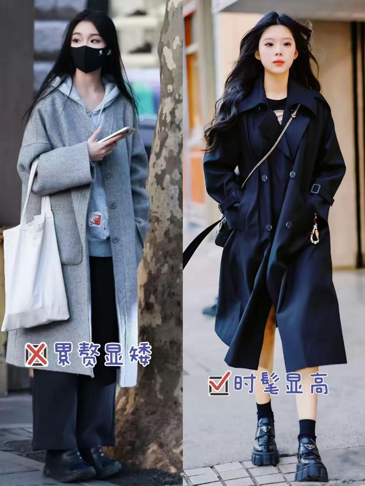 當我們穿着黑色運動鞋的時候,如果配黑色煙管褲、灰色呢大衣來穿,不僅顯的不夠體面、還有點顯矮、壓個子,視覺上不夠精緻。