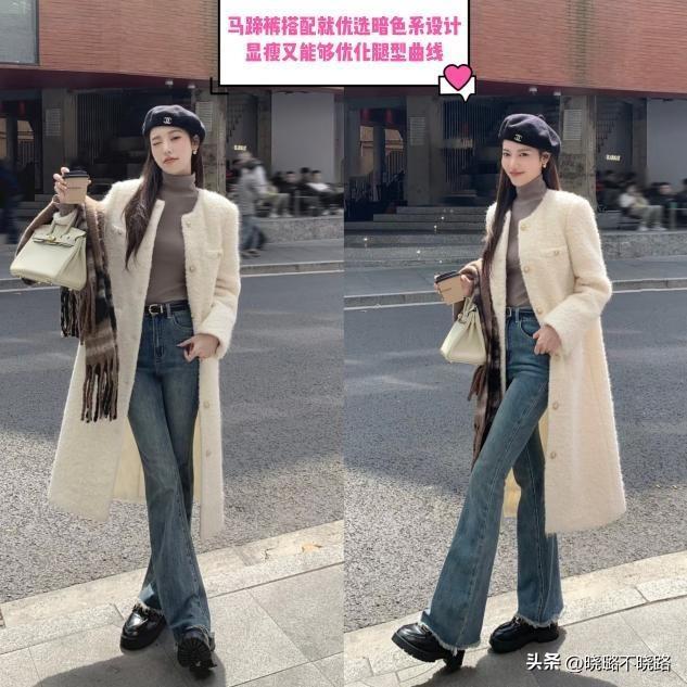 第1款褲裝在秋冬季節真的非常的適用於進行搭配,就是穿起來又高級又時髦的馬蹄褲,它本身的褲型狀態是屬於上半部分比較修身貼身、下半部分微擴的設計,所以這樣的版型在搭配起來的時候,其實可以很好的優化我們的腿型曲線,很適合腿型線條不好看的女性進行優選。