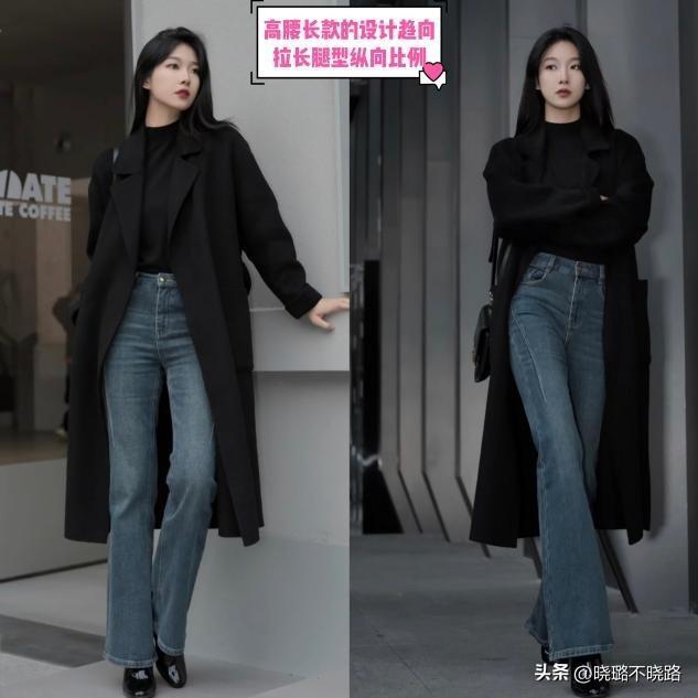 上面我們已經說過了,馬蹄褲和風衣或者大衣在進行組合的時候所起到的效果除了視覺上的美感之外,最明顯的就是優化我們的腿型曲線,所以建議大家可以將基礎色以及暗色調這樣的顏色進行入手,例如像黑色或者經典的深牛仔。