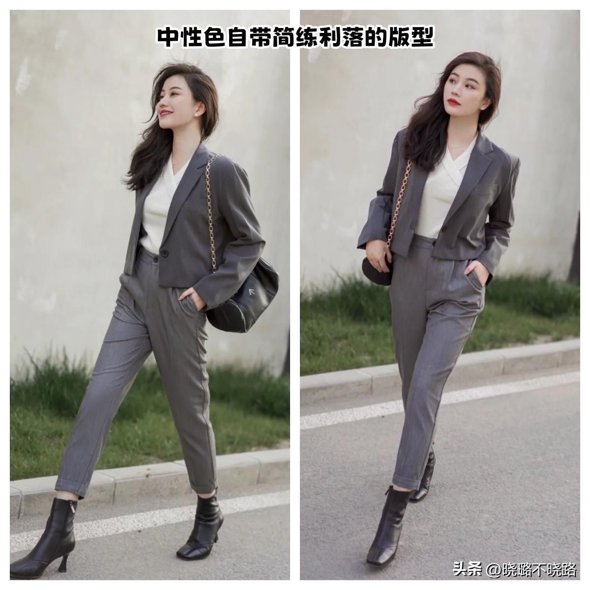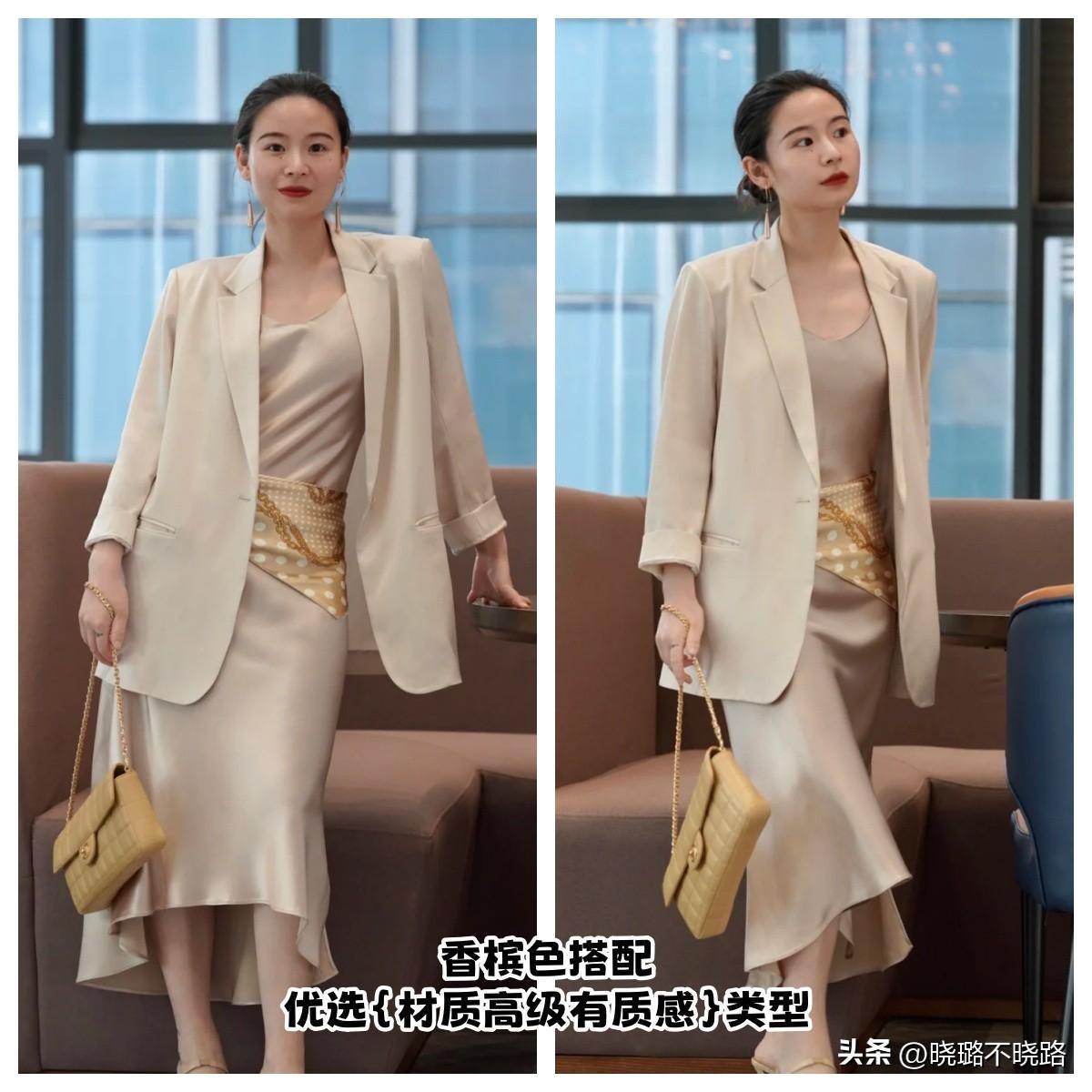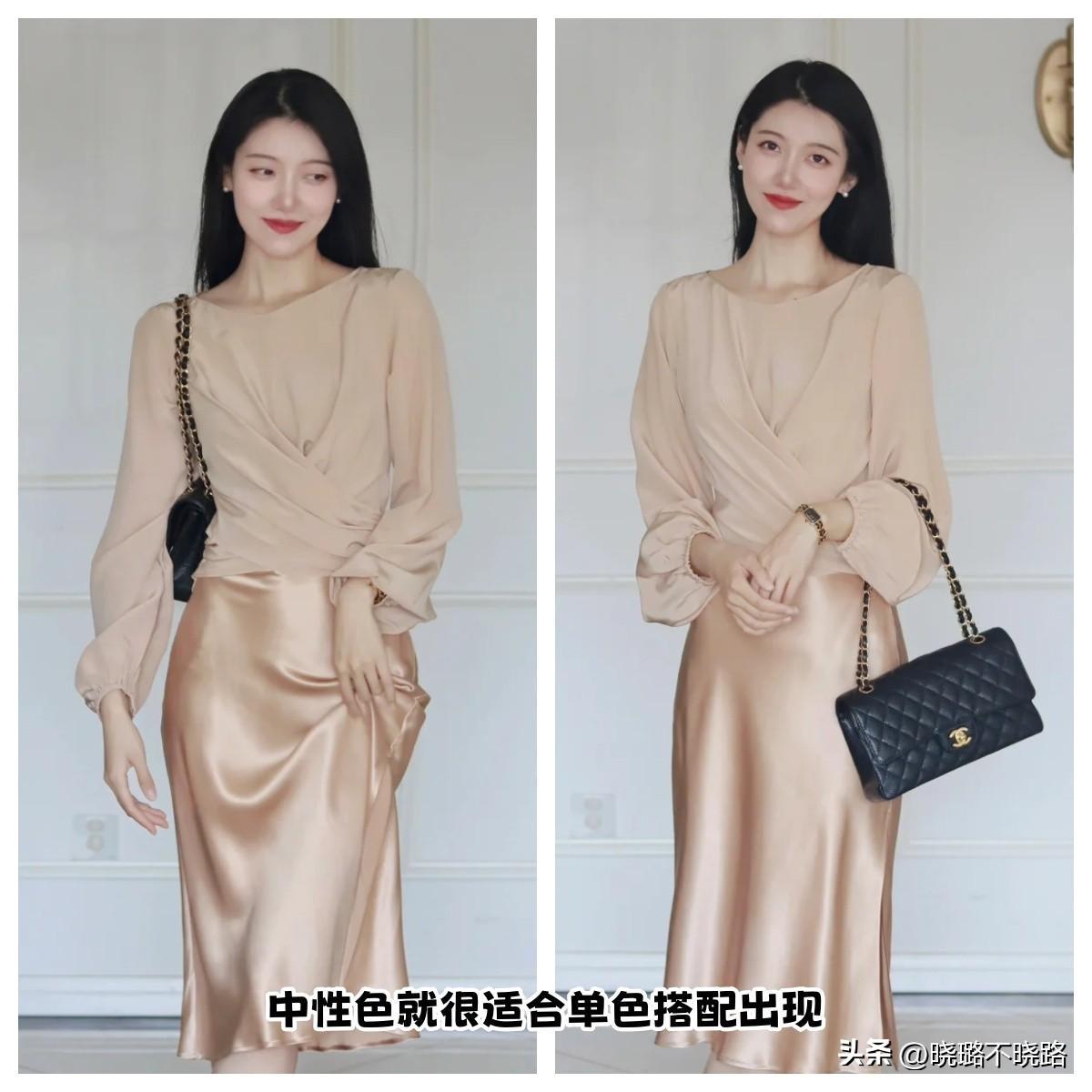 中性色的搭配其實非常的適合使其單色進行出現,尤其是像米白以及香檳色這樣的顏色本身在視覺上的利落感就比較的明顯。所以大家在進行優選搭配的時候,單品的系列也最好能夠襯托出來,視覺上非常明朗且簡練的版型狀態,像西裝又或者是比較偏長款的煙管型裙裝都非常適宜搭配。