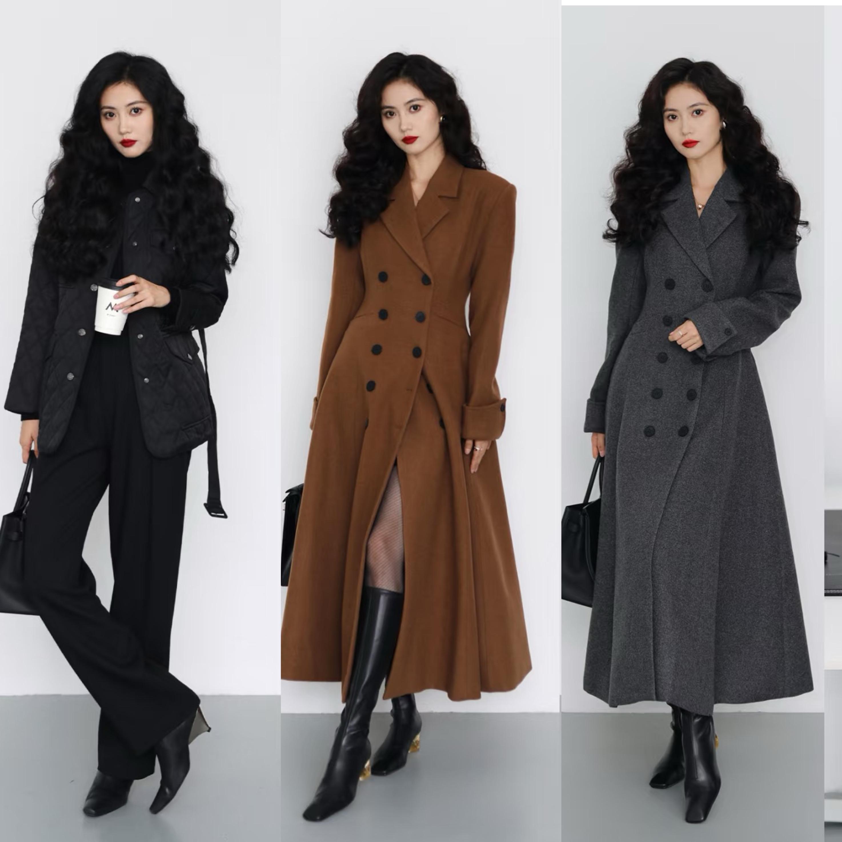 冬天裏的高智感穿搭,真的太有腔調了。像這種花灰色的雙排扣大衣,墊肩款式、H型剪裁,提氣場又顯高。