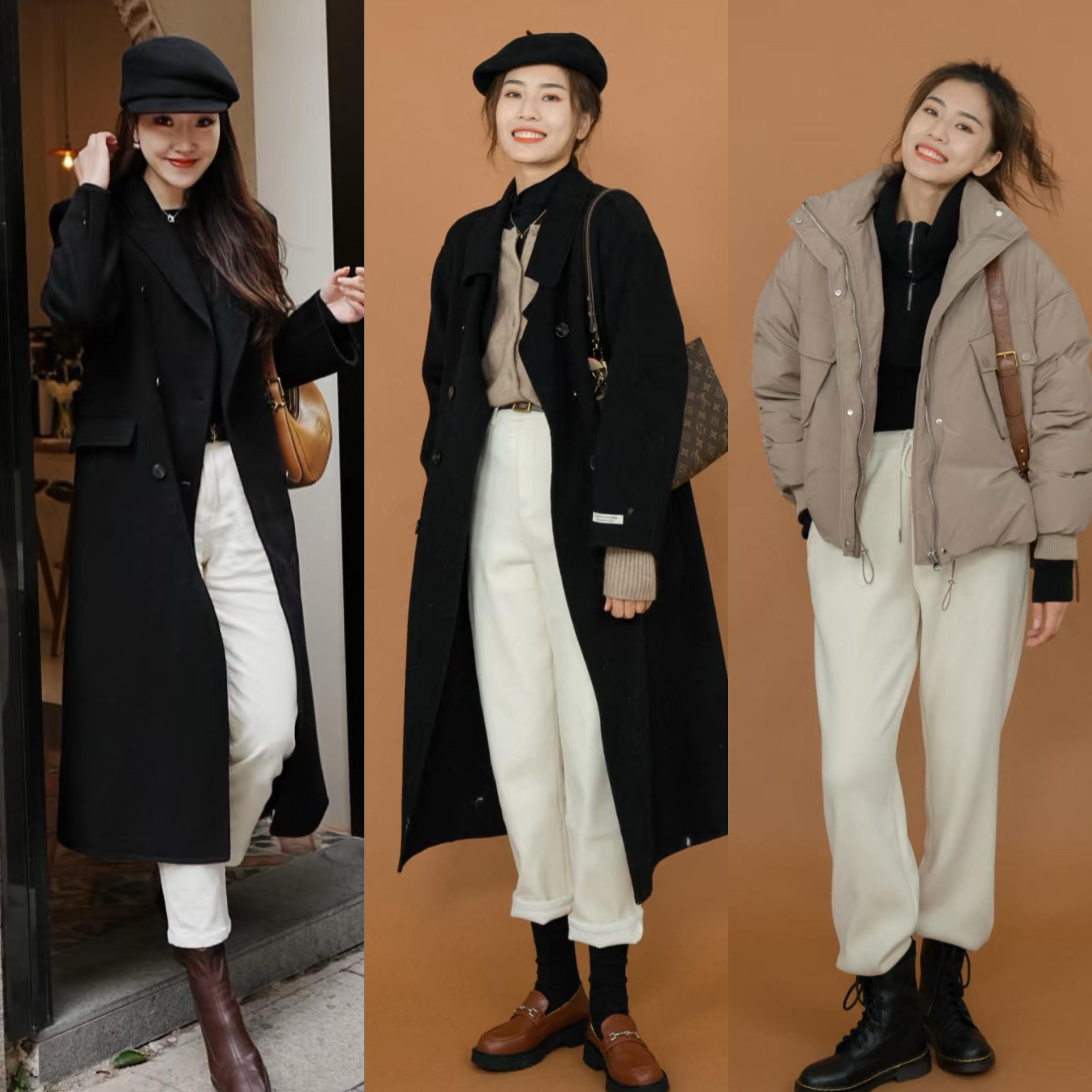 黑色大衣+白色褲子