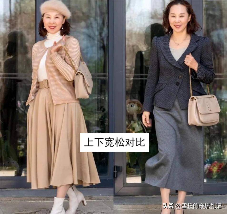 60歲女性的穿衣搭配的技巧上,不必太糾結於發福的身材,沒必要接受年輕人的白幼瘦,而是學會讓服飾之間有對比感。“松”和“緊”的平衡,可以選擇一些有收腰設計的上衣,再配上一條寬鬆又立體的長裙。
