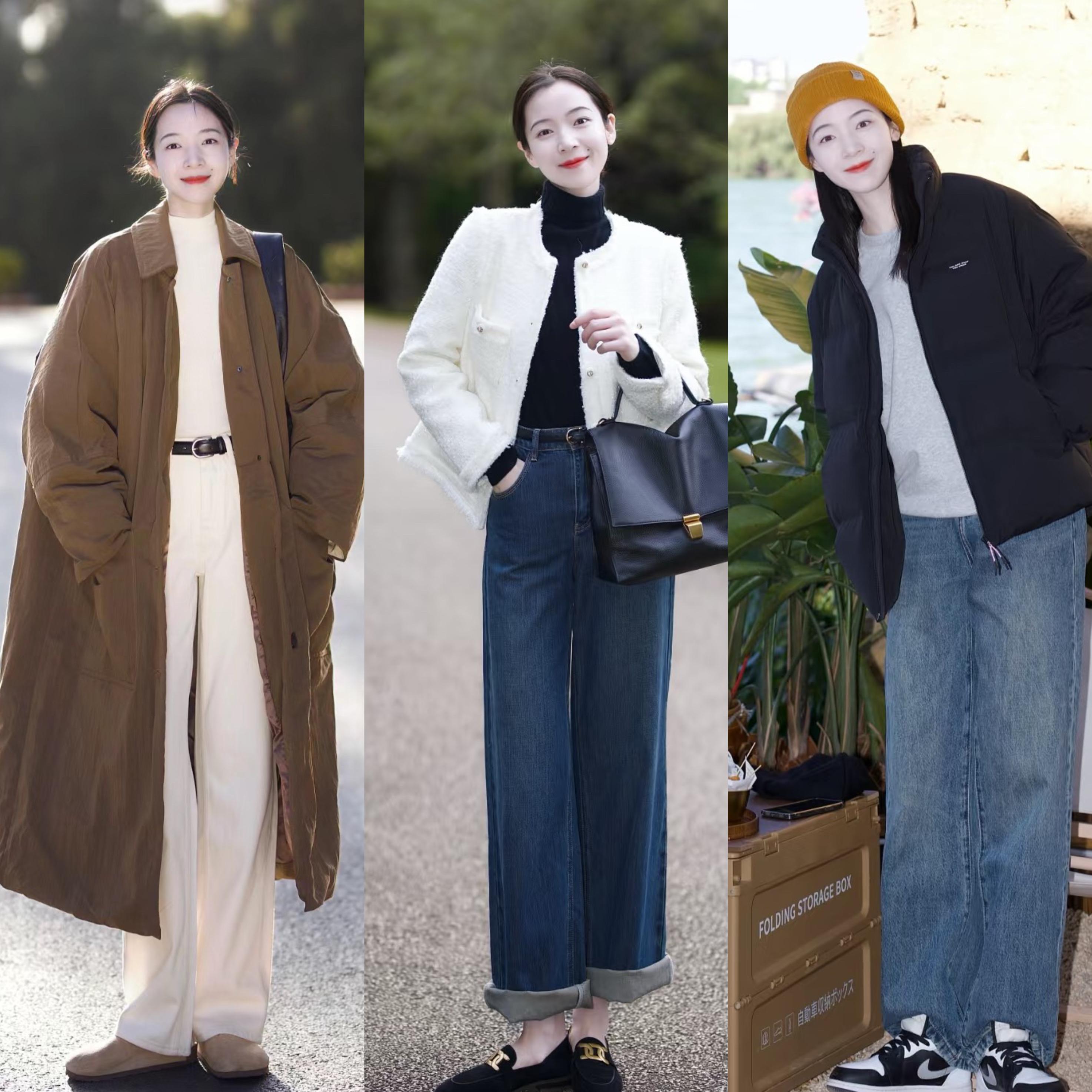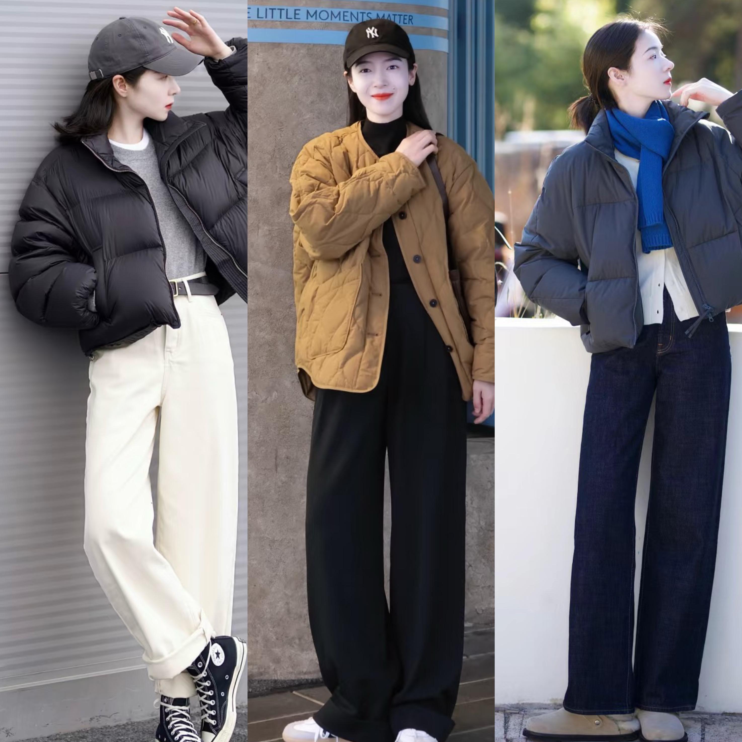 冬天裏搭配羽絨服,褲裝的選擇一定不要太拉垮。尤其是直筒褲的版型,儘量選擇比較挺括的材質,舒適度和時尚感都在線、氣場也足夠。