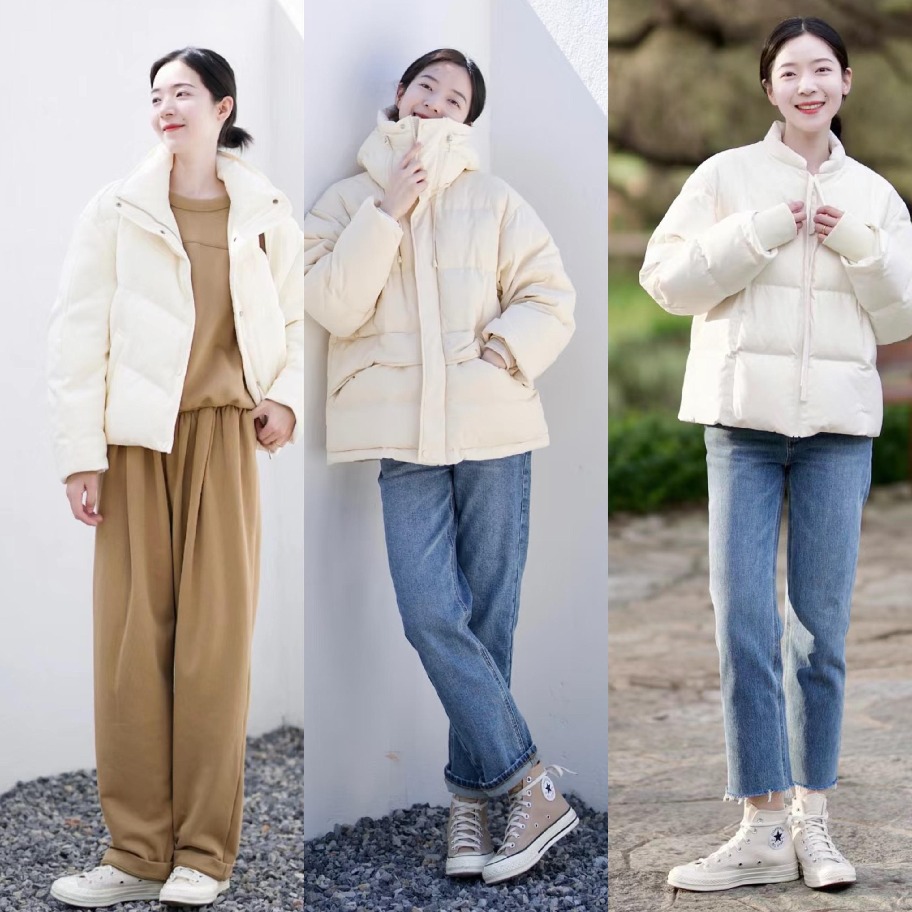 像這種淺色系的短款羽絨服,可以配高腰的九分牛仔褲。九分牛仔褲露出腳踝線條,更顯輕盈,也是時髦又減齡。