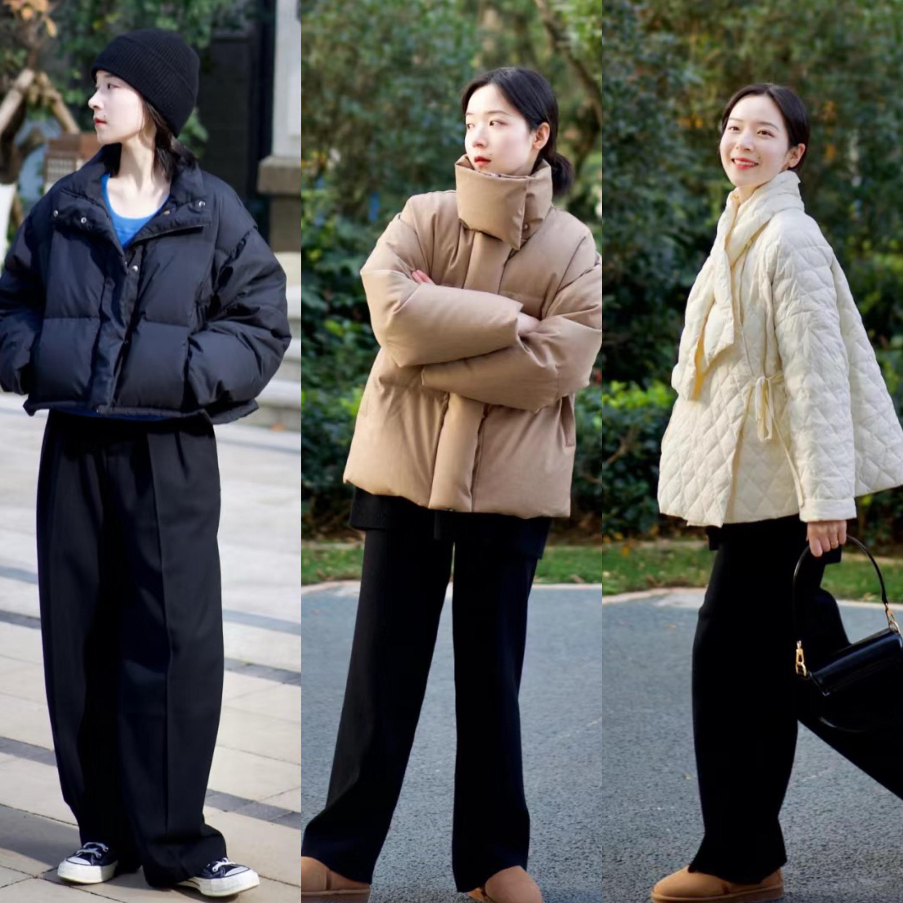 不管是蓬鬆羽絨服、還是絎縫羽絨服,都可以配經典的黑褲子。黑色直筒褲/闊腿褲都很百搭,用黑色褲子配厚底鞋,保暖又提氣質。