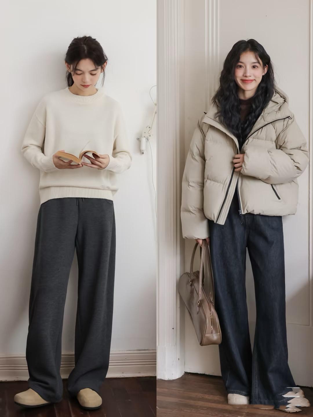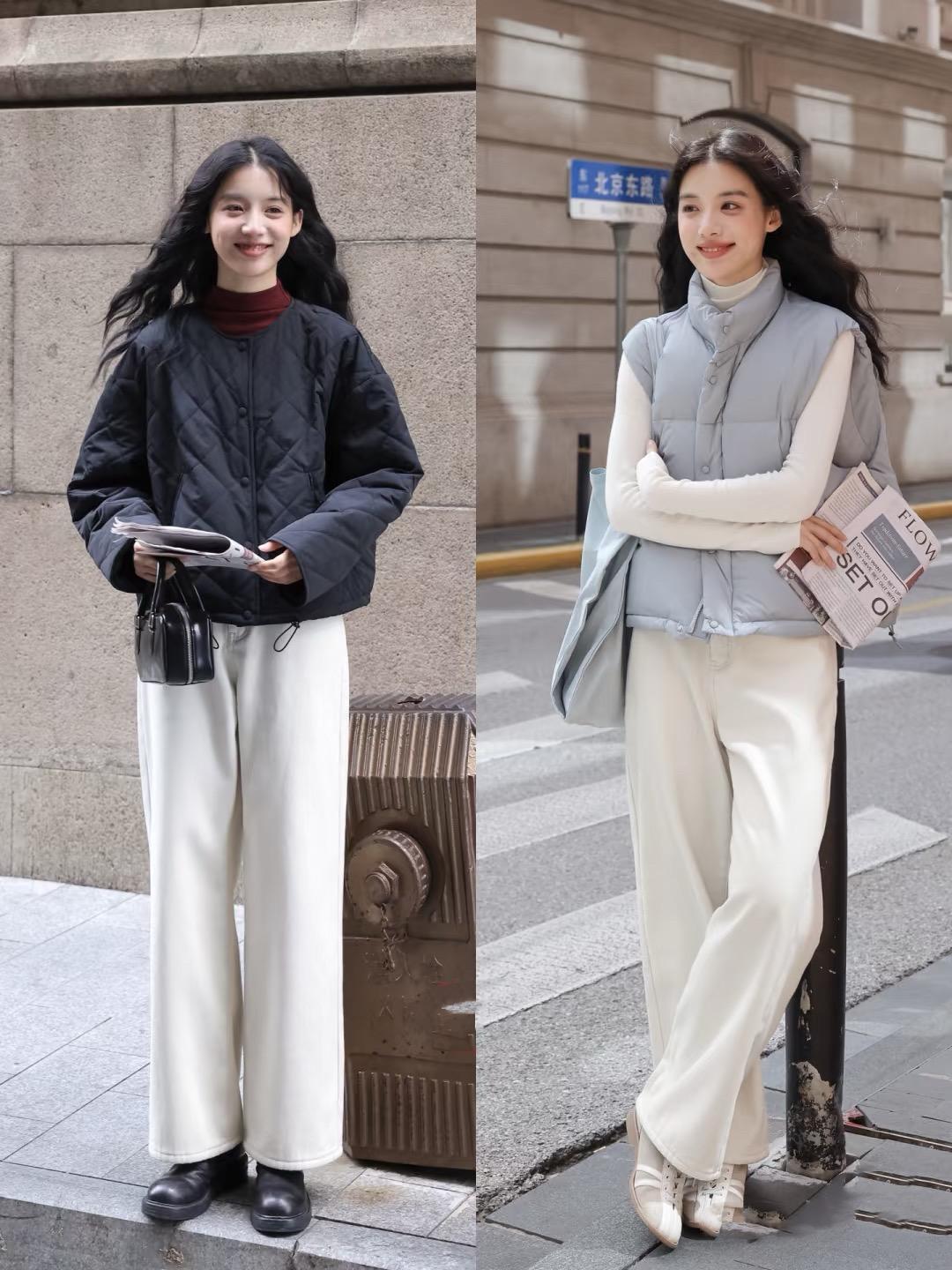 短款的羽絨服,配上高腰的白褲子、簡單幹淨又很顯氣質。白色的長褲子、我們可以選擇加絨面料、防風的厚實款式,就特別保暖。