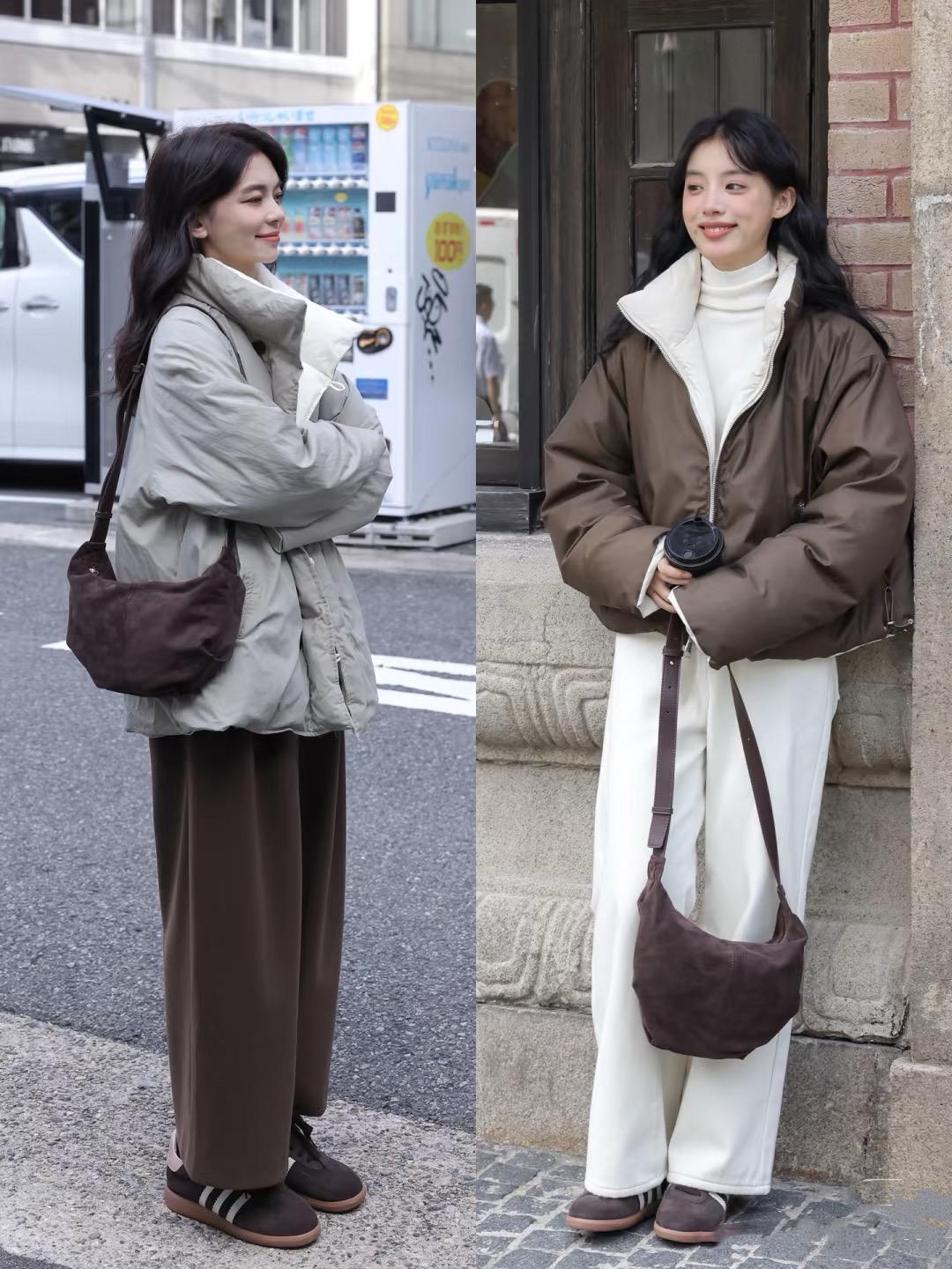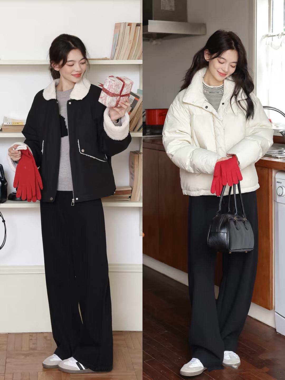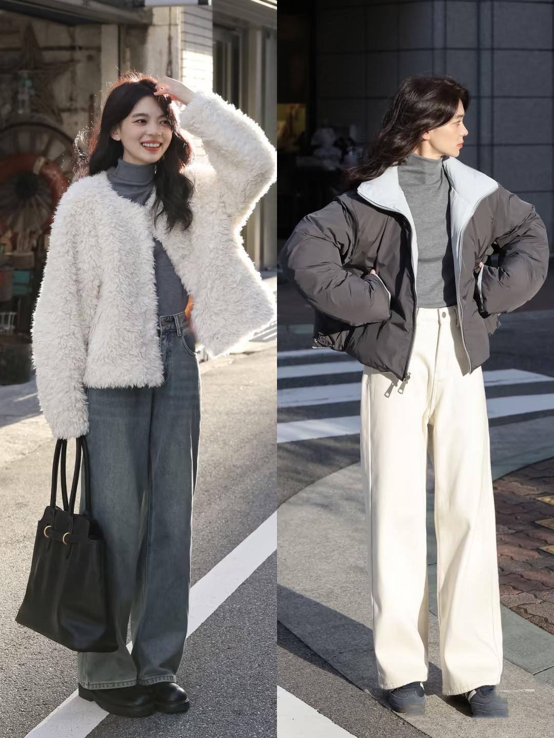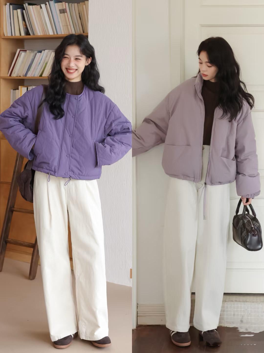 選擇短款羽絨服的時候,儘量搭配厚實一點的款式,充絨量足足的就很溫暖。厚實的短款羽絨服,配白色直筒褲、清爽大氣好有氛圍感。