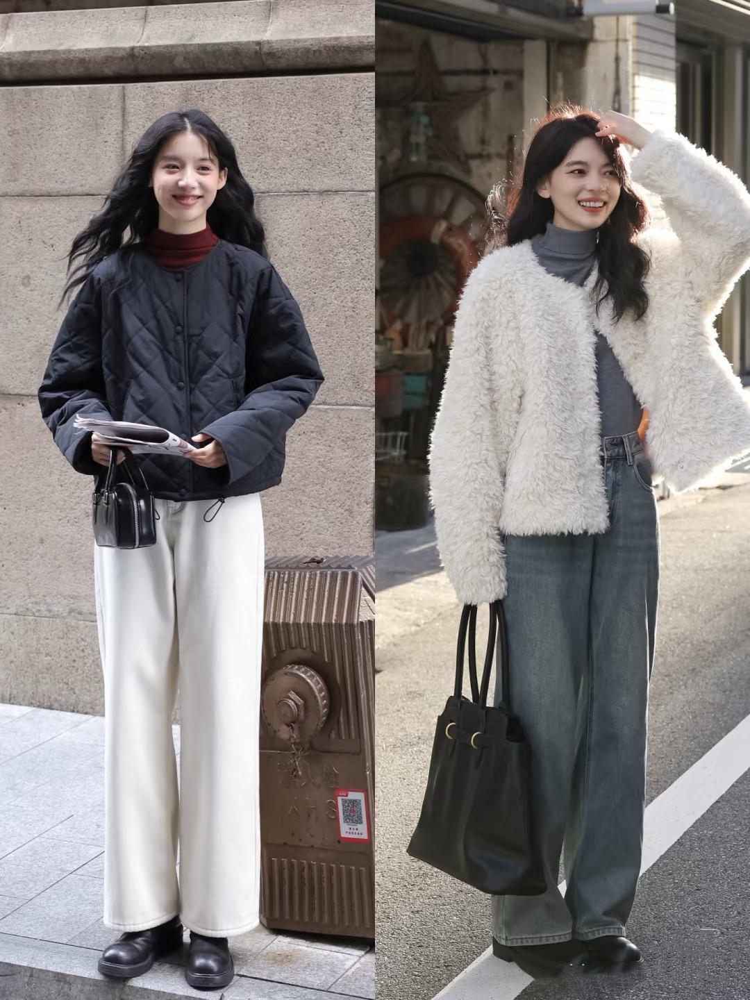 厚實一點的短外套也不會壓個子,直接配高腰的長褲來穿,大方又顯腿長。這種不露腿的搭配,低調保暖、也很耐看,太適合小個子了。