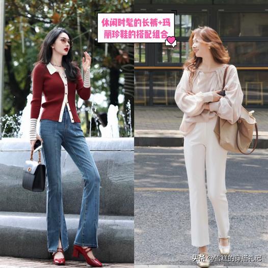 而比較偏向於休閒感一些的搭配,那麼就是高腰且偏長款的拖地褲了,推薦大家可以優選像馬蹄褲以及山本褲這樣的系列本身就自帶着優化腿型,而且氣質也很簡約時髦的系列,瑪麗珍的話還是要將低跟或者是高跟的版型優選,能夠拉長腿型增高身形。