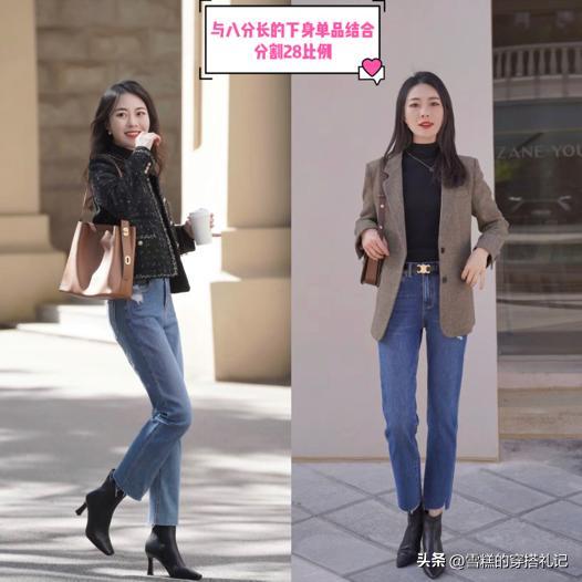 短靴它本身的比例就是剛好包裹住了我們的腳踝部位,所以建議各位女性尤其是腿型不太長的身形狀態,就非常的適合結合搭配八分長系列的裙裝以及褲裝這樣的單品。整個下半身的視覺比例是能夠將非常極具纖長感的28分營造分割出來的。