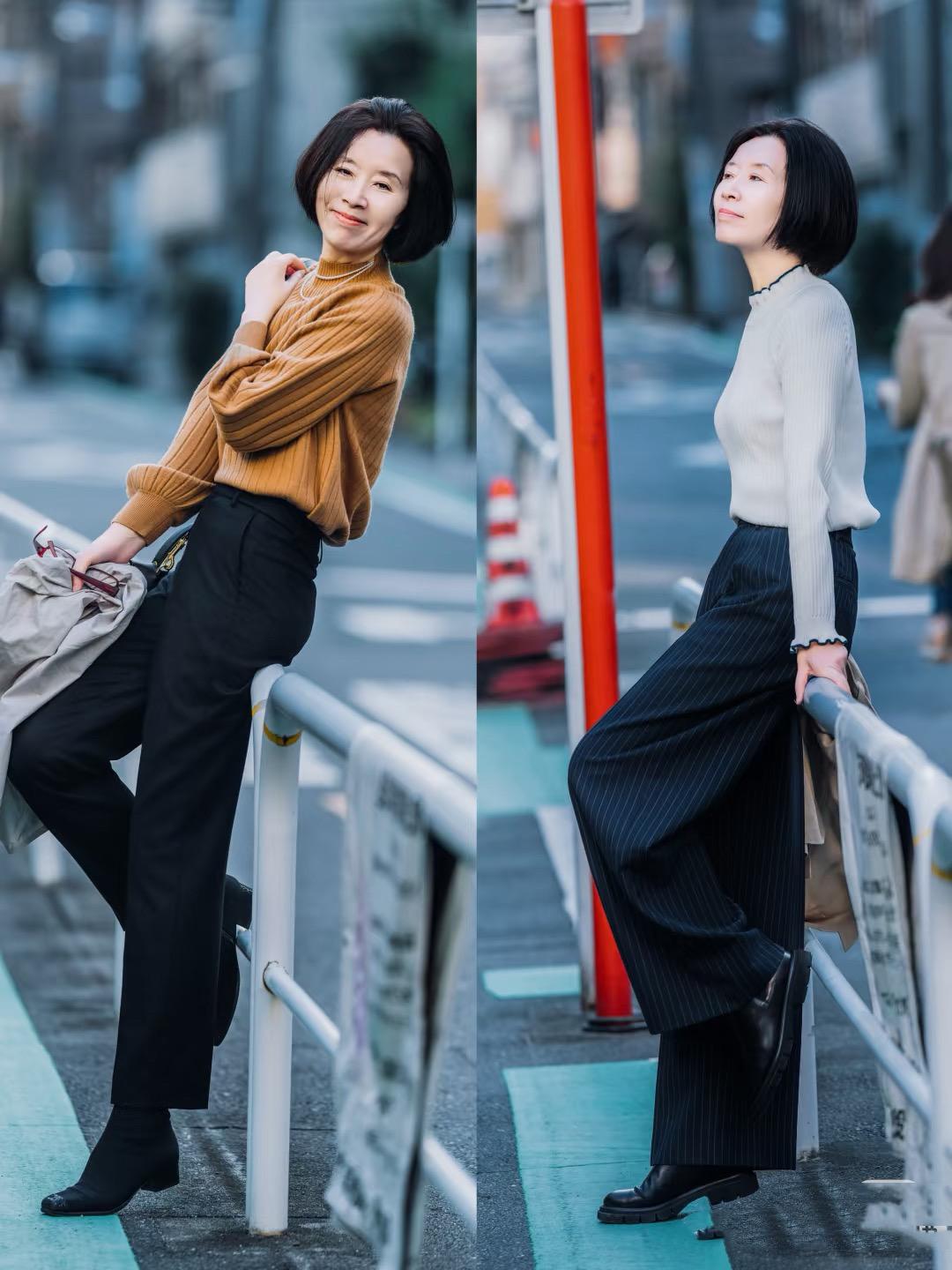 煙管褲、直筒褲,也是比較適合大齡女性的單品。50+的阿姨,穿一條利落直筒褲或者煙管褲,顯得雙腿線條更加筆直。