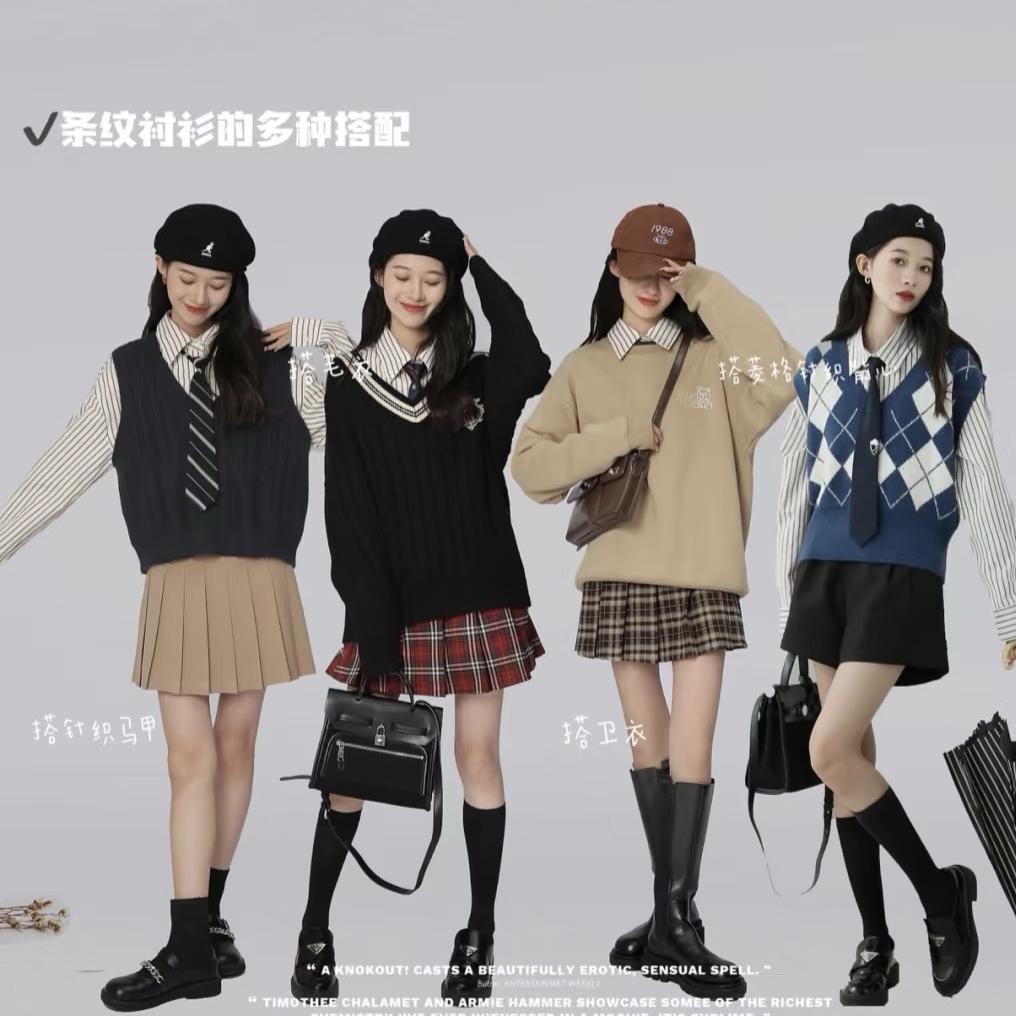 黑白條紋的襯衫,可以配V領馬甲、針織衫,也可以搭配衛衣等單品,俏皮又耐看。下身配短裙的話,就更精緻俏皮。條紋襯衫作爲內搭,疊搭韓系領結也更時髦。