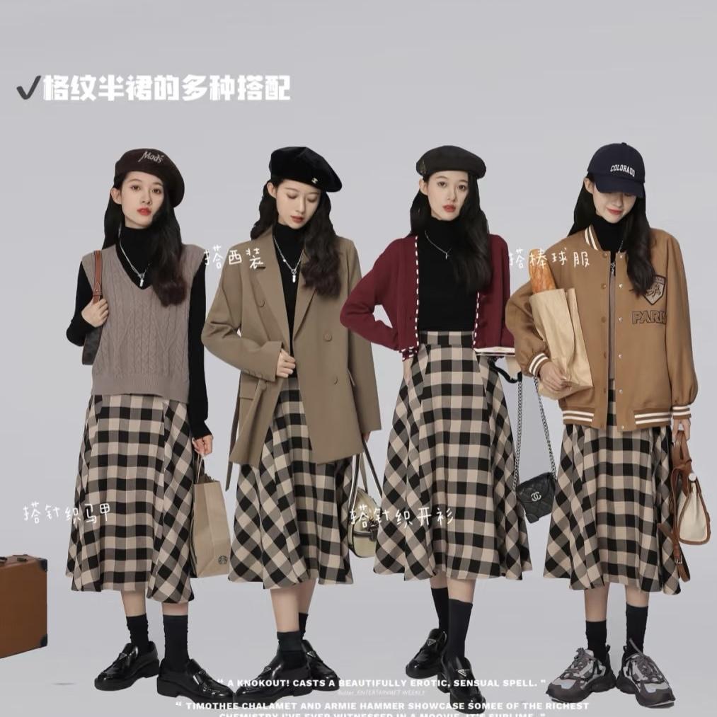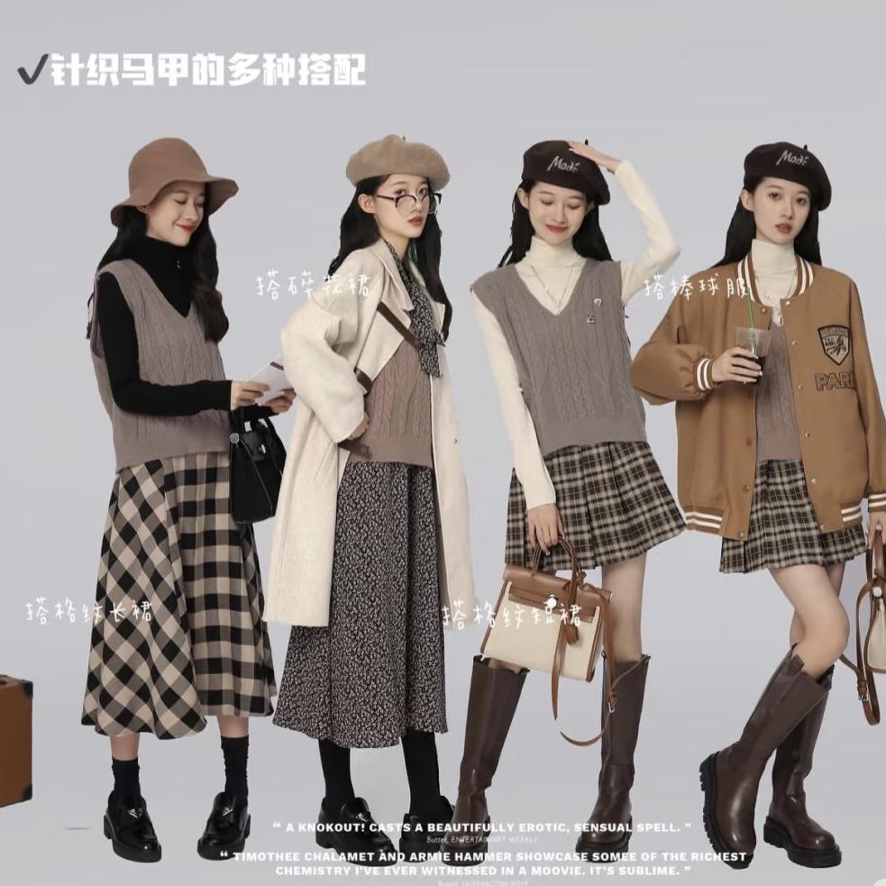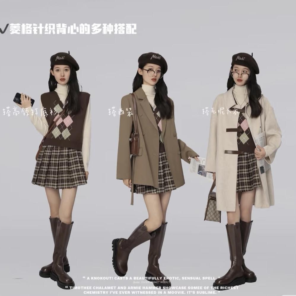 針織馬甲配格子半身裙、棕色長裙真的是好有學院風的氣質。我們可以搭配不同款式的外套,營造不一樣的風格氣質。過膝長靴厚底款式、顯腿細又很保暖。