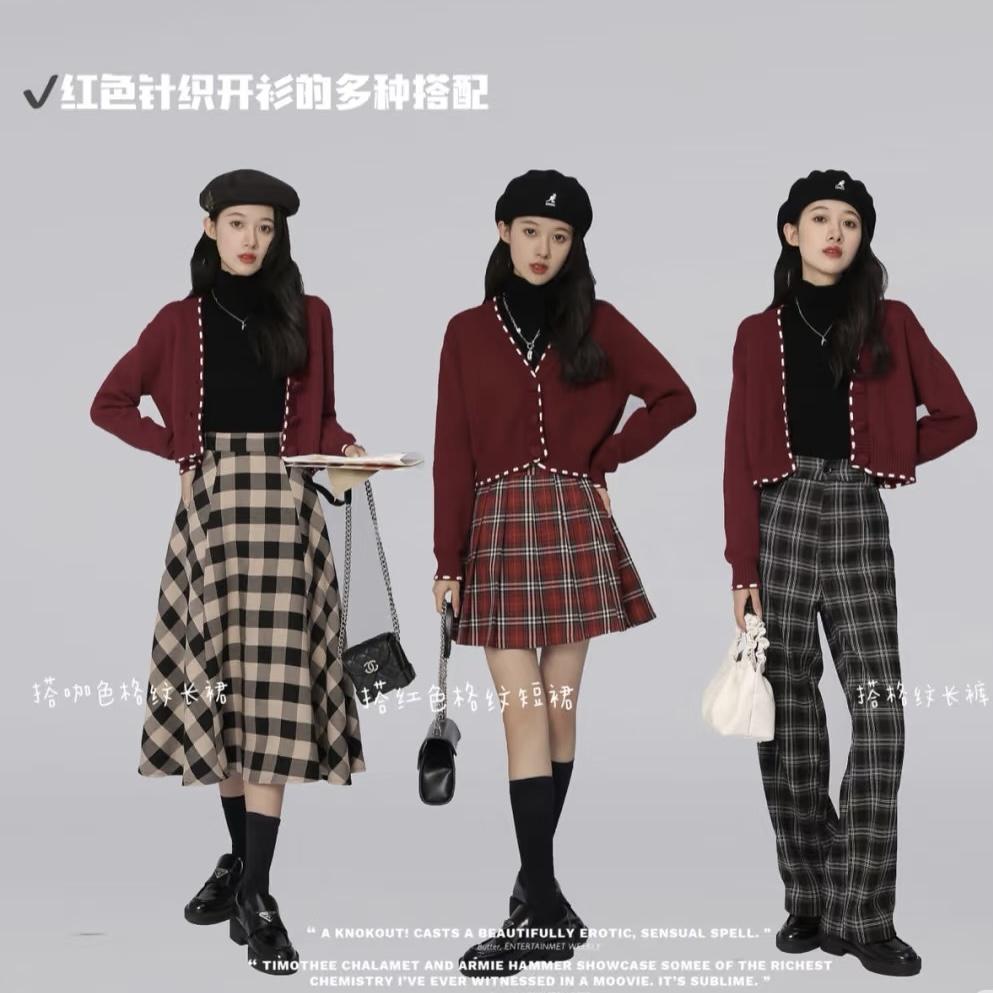 紅色針織開衫,配格子半身裙、或者格子褲,也是截然不同的風格。搭配長款格子半身裙、或者短款格子半身裙,不同的風格屬性也能讓人眼前一亮。