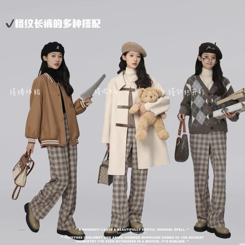 復古風的格紋長褲,真的是超級流暢。高腰的款式、直筒的版型、還可以選擇加絨面料,穿起來大方又保暖。