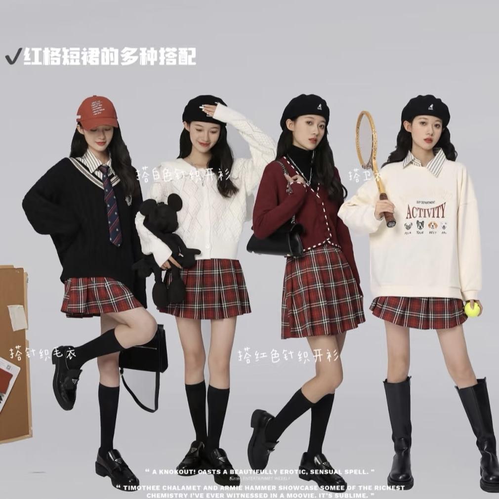 一條文藝風的紅色格子短裙,也是非常百搭的。這種紅格短裙,不單調又更加醒目,配衛衣、針織衫、襯衫都可以自由搭配。