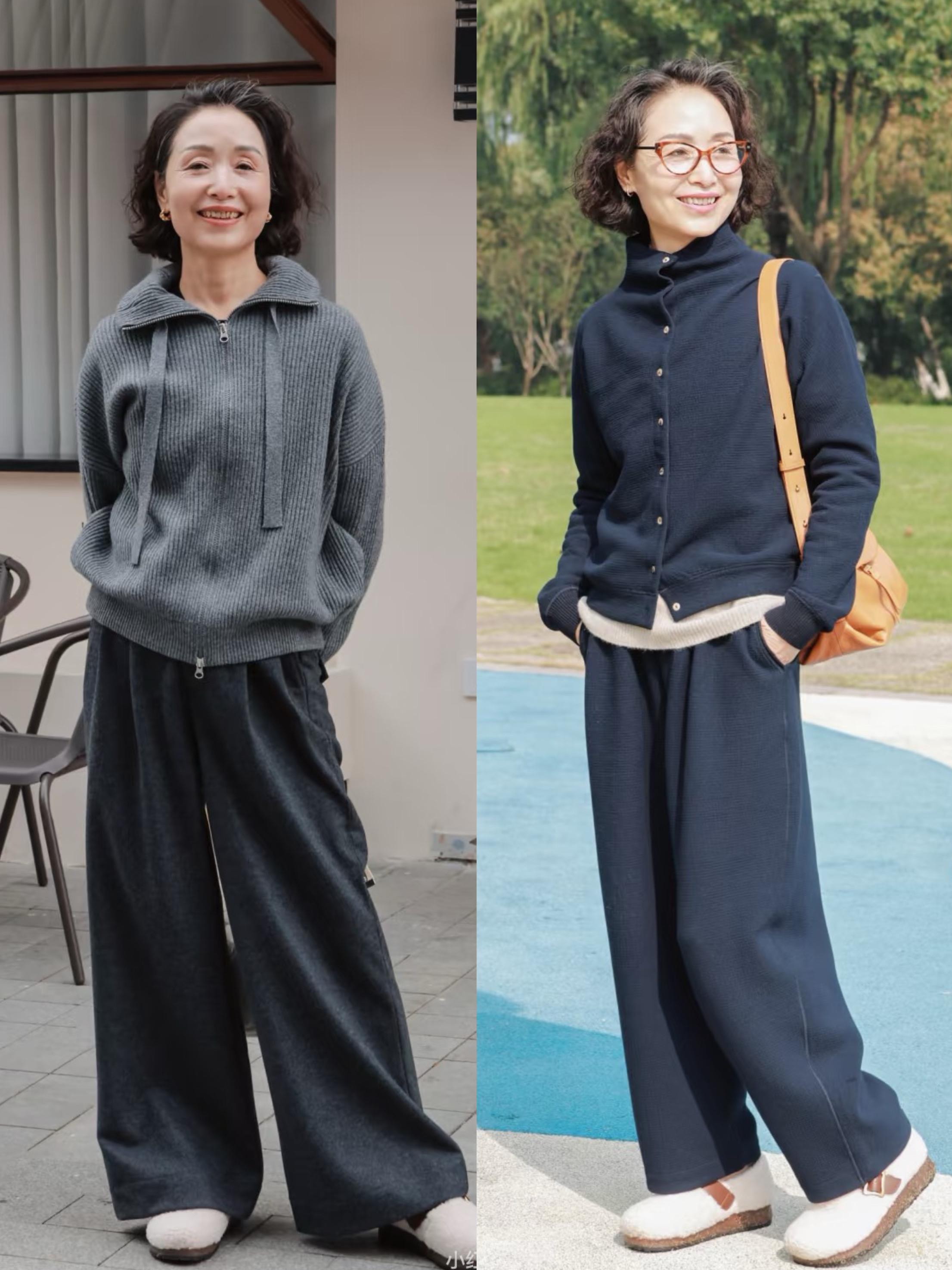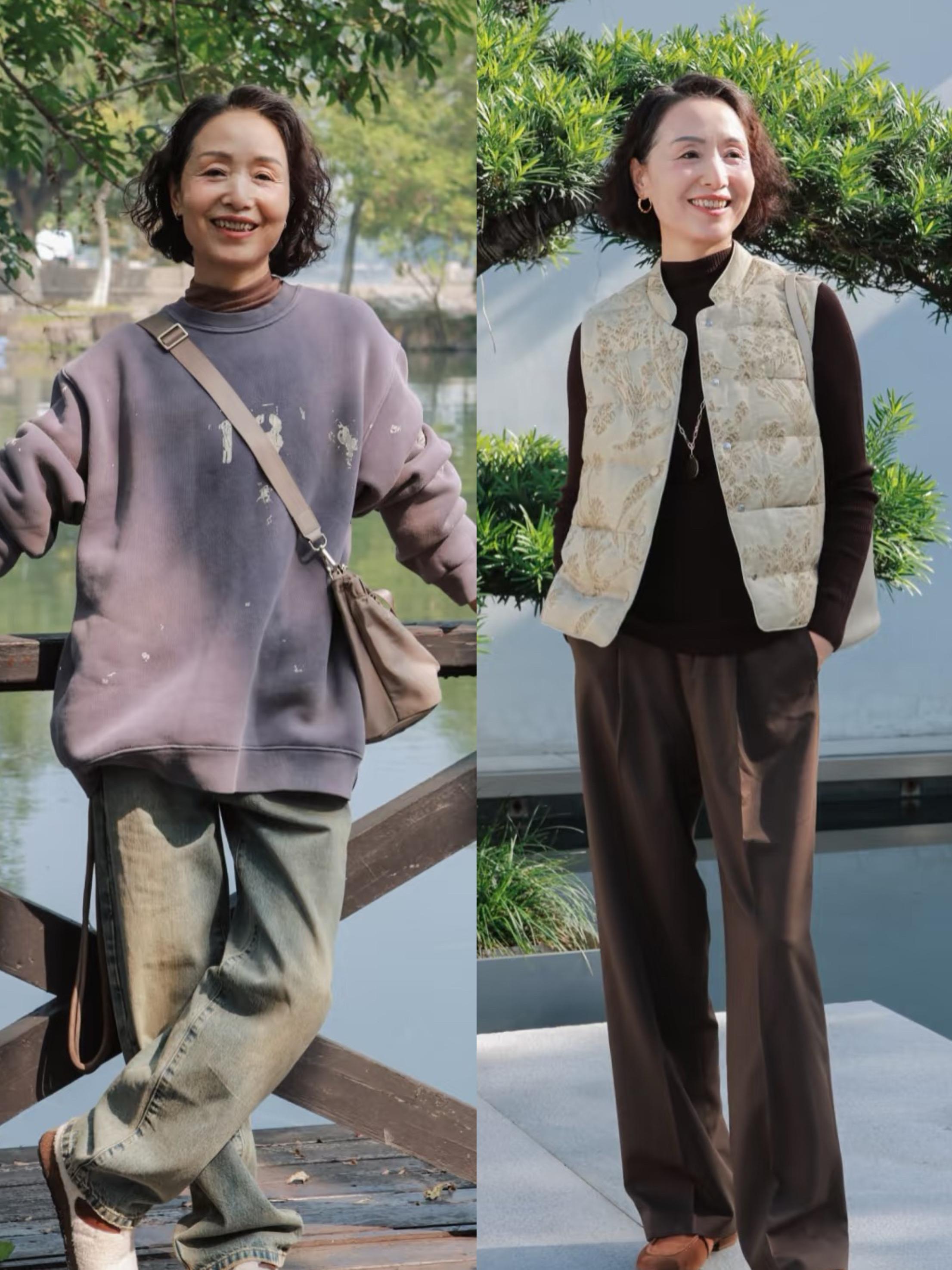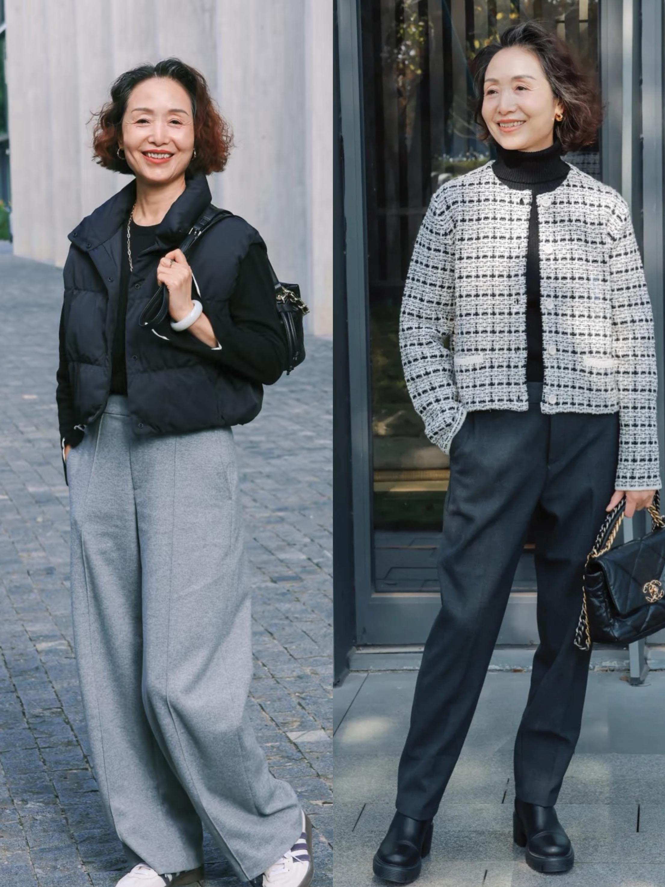 穿休閒減齡的衣服,但從來不會顯得誇張。比如黑色打底衫+羽絨馬甲,舒適又保暖、帶着輕盈感,配上毛呢闊腿褲,就很大方。