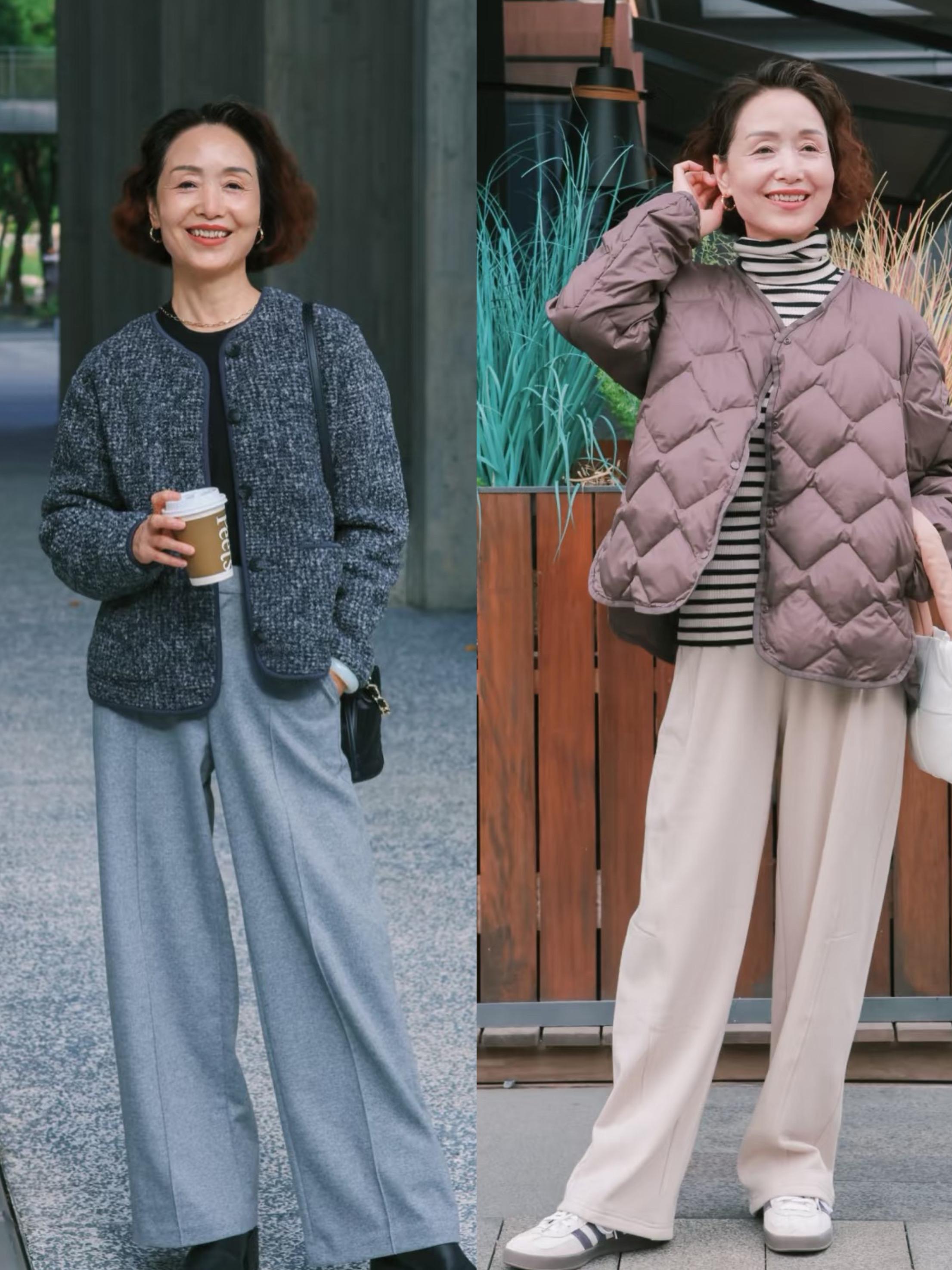 短上衣+長褲,也是經典的上短下長的組合,穿起來利落又顯高。不管是小香風外套、還是絎縫羽絨服,都可以配短款的版型。