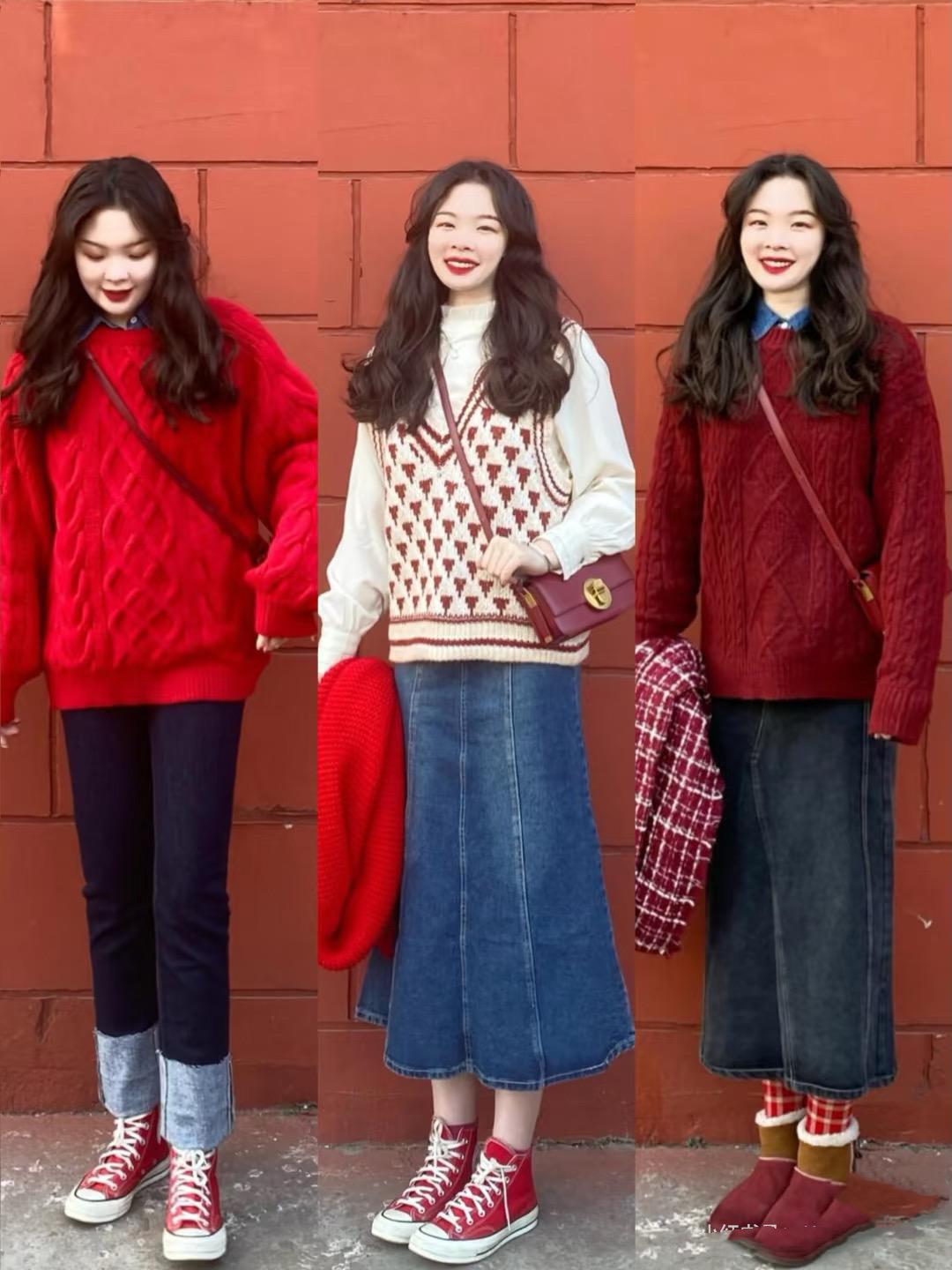 比如藍色的牛仔襯衫,我們可以配紅色針織衫來穿着。藍色牛仔襯衫作爲內搭、洋氣又保暖,領口層次感更豐富,也是特別的高級。