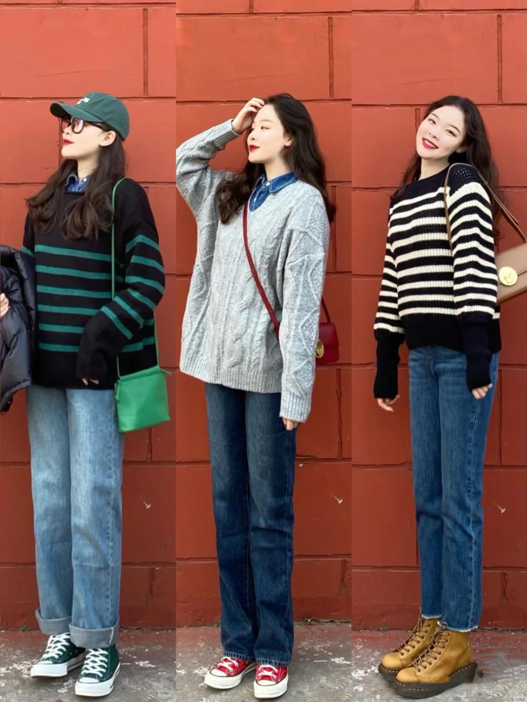簡潔利落、又特別耐看的一組搭配,真的是太讓人喜歡了。日常的穿搭裏,條紋毛衣、或者條紋打底衫,都可以配直筒牛仔褲來穿着。