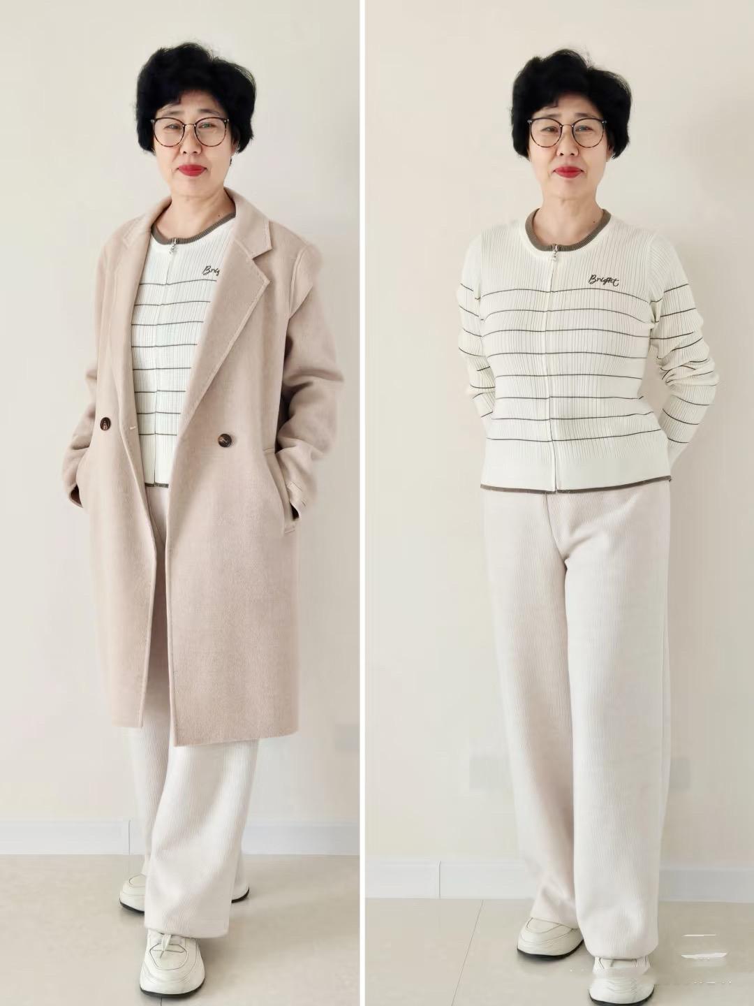 清新又大氣的穿搭,顯白也很減齡。上了年紀,有時候不敢嘗試這種簡潔的大衣,總怕顯胖、其實也還好。