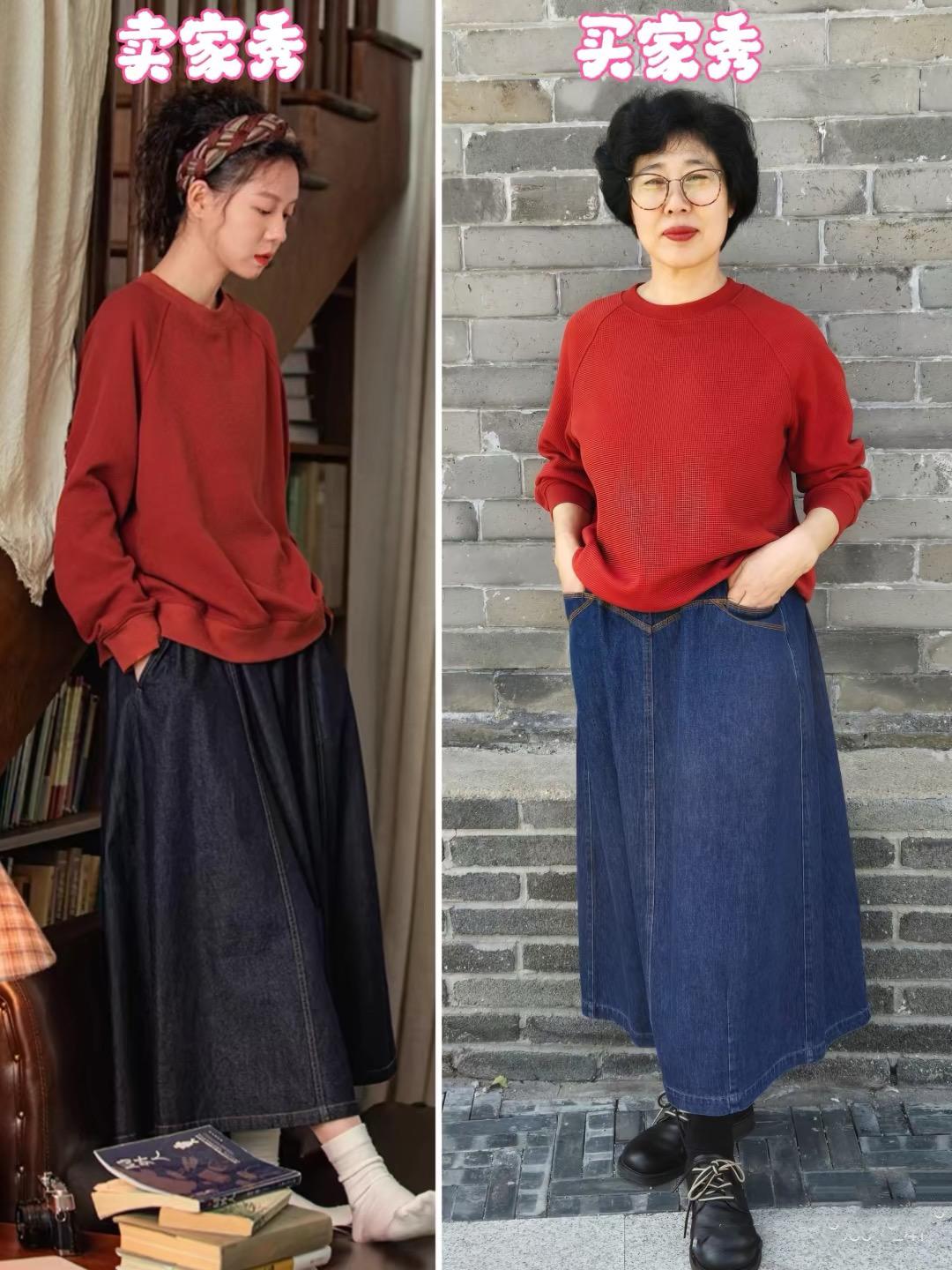 慵懶的紅色毛衣,配了藍色牛仔半身裙來穿,屬於一種簡潔又高級的美。這種紅色毛衣,搭配高腰的藍色牛仔半身裙,包容腰臀部的厚重,更顯瘦。
