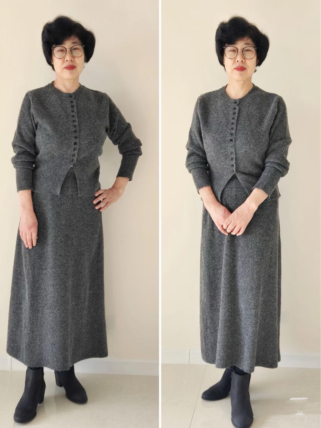 一件半高領的打底衫,配上素雅的花灰色半身裙,搭配短筒靴、很高級也很時尚。短筒靴稍微帶跟的設計,就特別的利落。