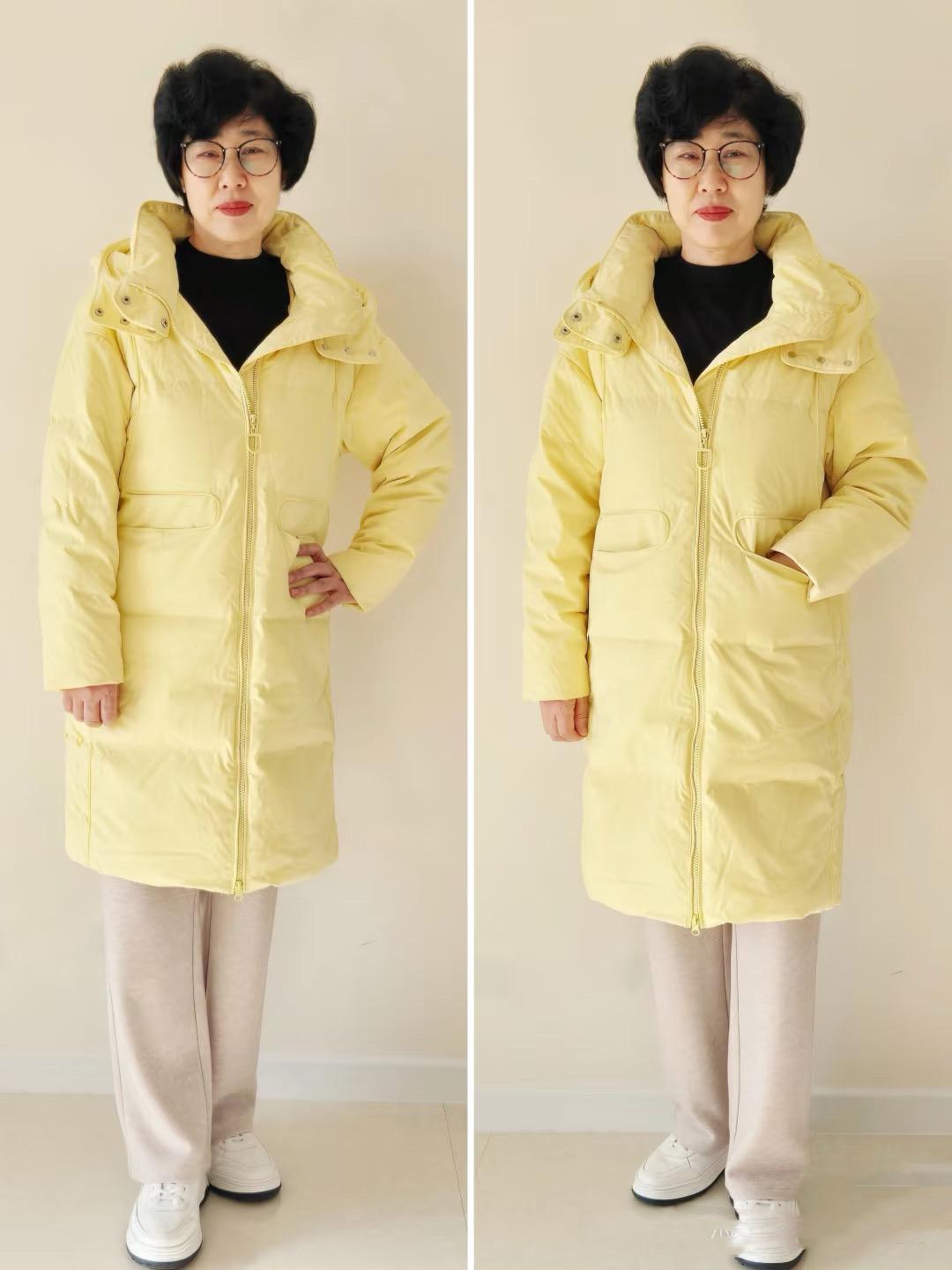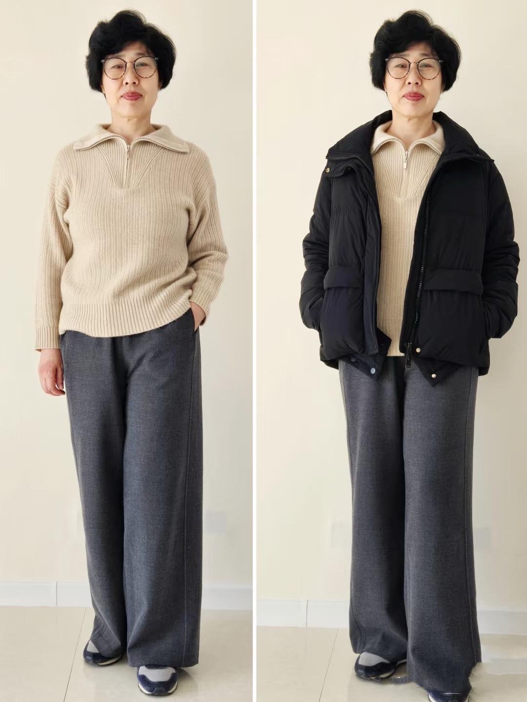 有時候想要低調一點,可以穿着素雅高級的配色。比如燕麥色的半拉鍊毛衣、配上黑色翻領羽絨服、簡單又保暖。