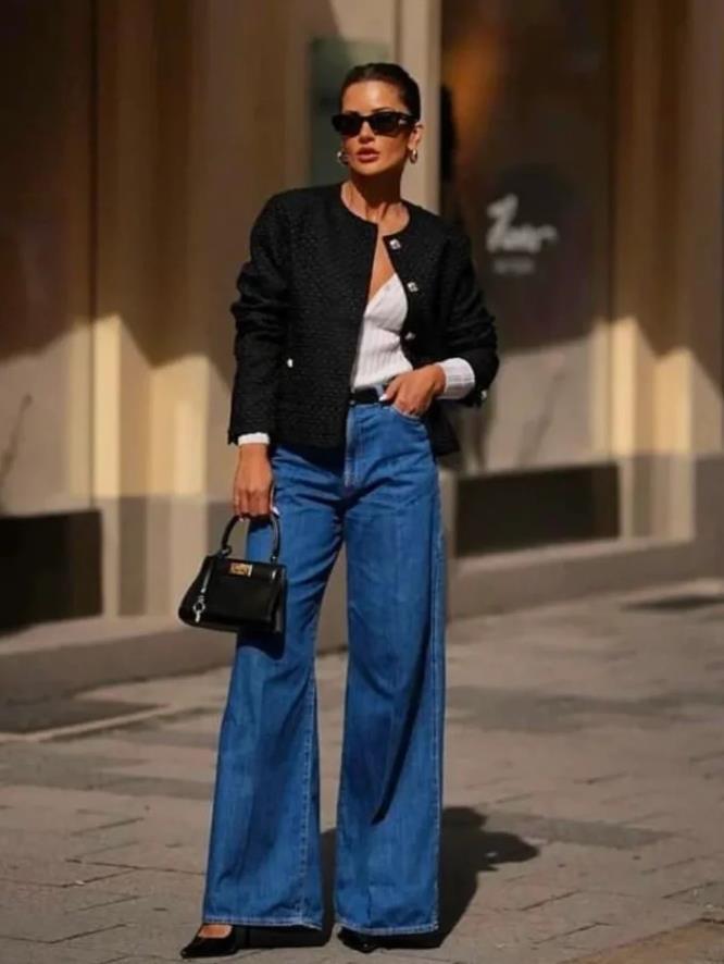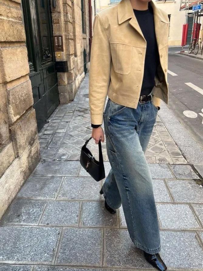 對於小個子女生而言,這種短款的外套是最合適的了,輕鬆穿出幹練利落又不失率性,內搭一件黑色打底,視覺上看起來就非常顯瘦。搭配一條牛仔闊腿褲,那可太顯瘦和藏肉了,整個着裝運用了上短下長的方式,輕鬆穿出大長腿和高挑感。