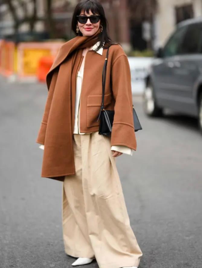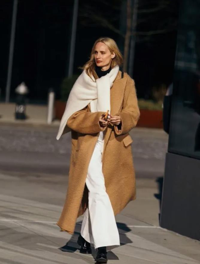 這種咖色的短款雙面大衣,是真的非常有氣質呢,內搭一件白色襯衫,這兩種顏色組合在一起,完全沒有問題。能輕鬆就穿出好衣品,搭配一條卡其色闊腿褲,休閒又不失幹練,脖子上搭配一條卡其色圍巾,與外套進行了呼應,增加造型的和諧度,腳下踩着一雙白色尖頭鞋,時髦又顯腿長。