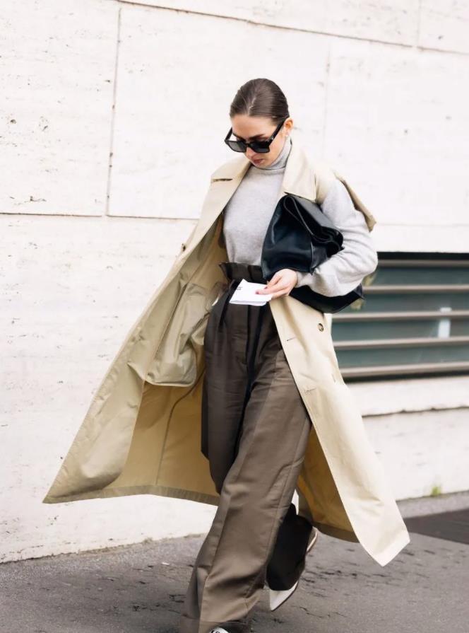 卡其色的風衣,這個顏色看起來也太不失氣質了,每到秋冬季節都很流行額色調,內搭一件淺灰色高領毛衣,應對寒冬這麼穿可一點都不會讓人覺得冷。最重要的是這麼穿也很顯高,同時也不失高級感,搭配上一條高腰闊腿褲,整個人瞧着也太不失氣場了,腳下配一雙白色尖頭平底鞋,又不自覺拉長腿部線條。