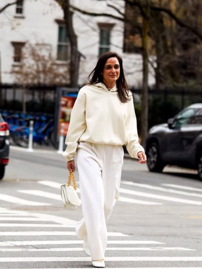 奶白色的連帽衛衣,這個色調看起來也太百搭了,最重要的是能讓你穿出溫柔感,溫度比較低的時候,可以在裏面疊穿一件打底,增加層次感的同時又保暖。這樣簡單的搭配往往是最能凸顯出一個人的魅力和氣場。腳下踩着一雙白色平底鞋,有種很極簡高級感,也能穿得舒服自在。