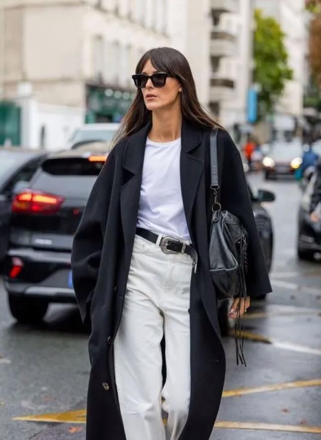 黑色雙面大衣,質感看起來就非常不錯,寬鬆的版型,對身材是一點違和感都沒有,內搭一件白色t恤,這麼穿能毫不費力展現出休閒與高級感。下身配一條白色牛仔闊腿褲,很好展現出氣質和風度,搭配一雙白色運動鞋,又很好穿出休閒的氣息。