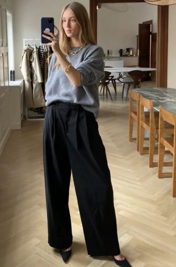 很喜歡這種高級灰毛衣,基礎簡約的款式,無論是怎麼穿都不容易出錯,搭配一條黑色西裝闊腿褲,就能展現出一種屬於大女人的氣場,再加上黑灰的配色組合,看着就非常高級,毛衣前面的下襬塞一點進去到褲子裏面,更是提高了腰線比例,將雙腿比例給拉長了。