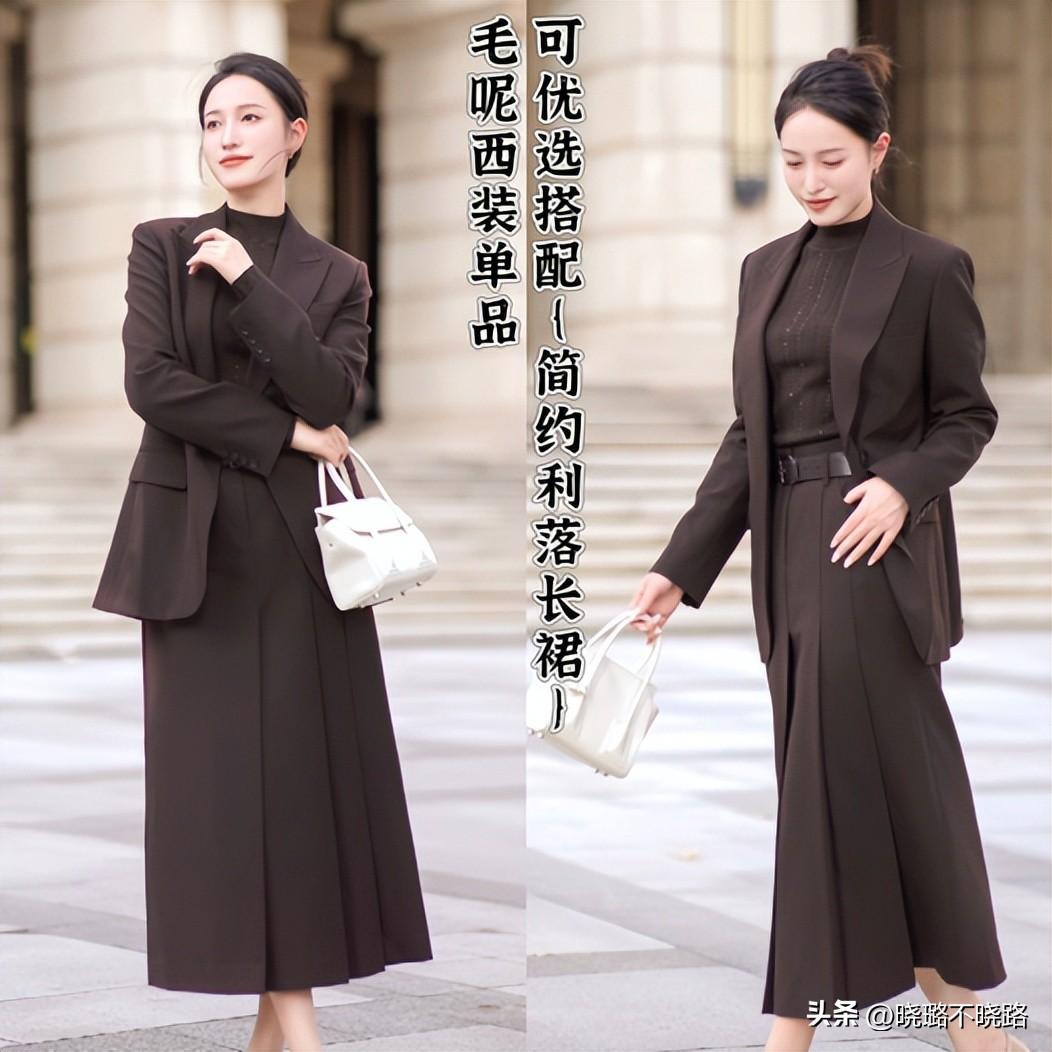 第2款則是推薦各位職場當中的女性可以優先選擇像毛呢西裝這樣的外套單品,在保暖度上也是秋冬季節可以放心進行入手的搭配。但在視覺上還是要保持絕對的基礎基調,所以建議大家的毛呢西裝以及所運用的長裙都是比較基礎百搭經典的色系。
