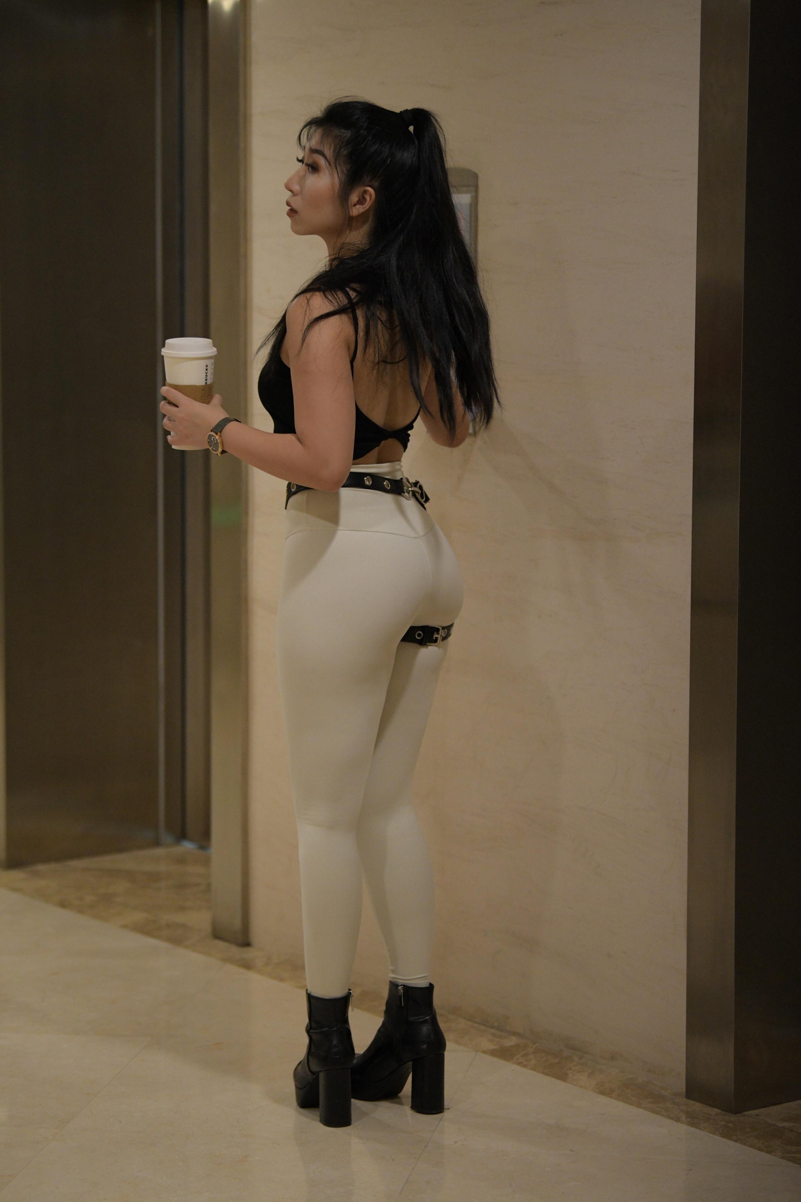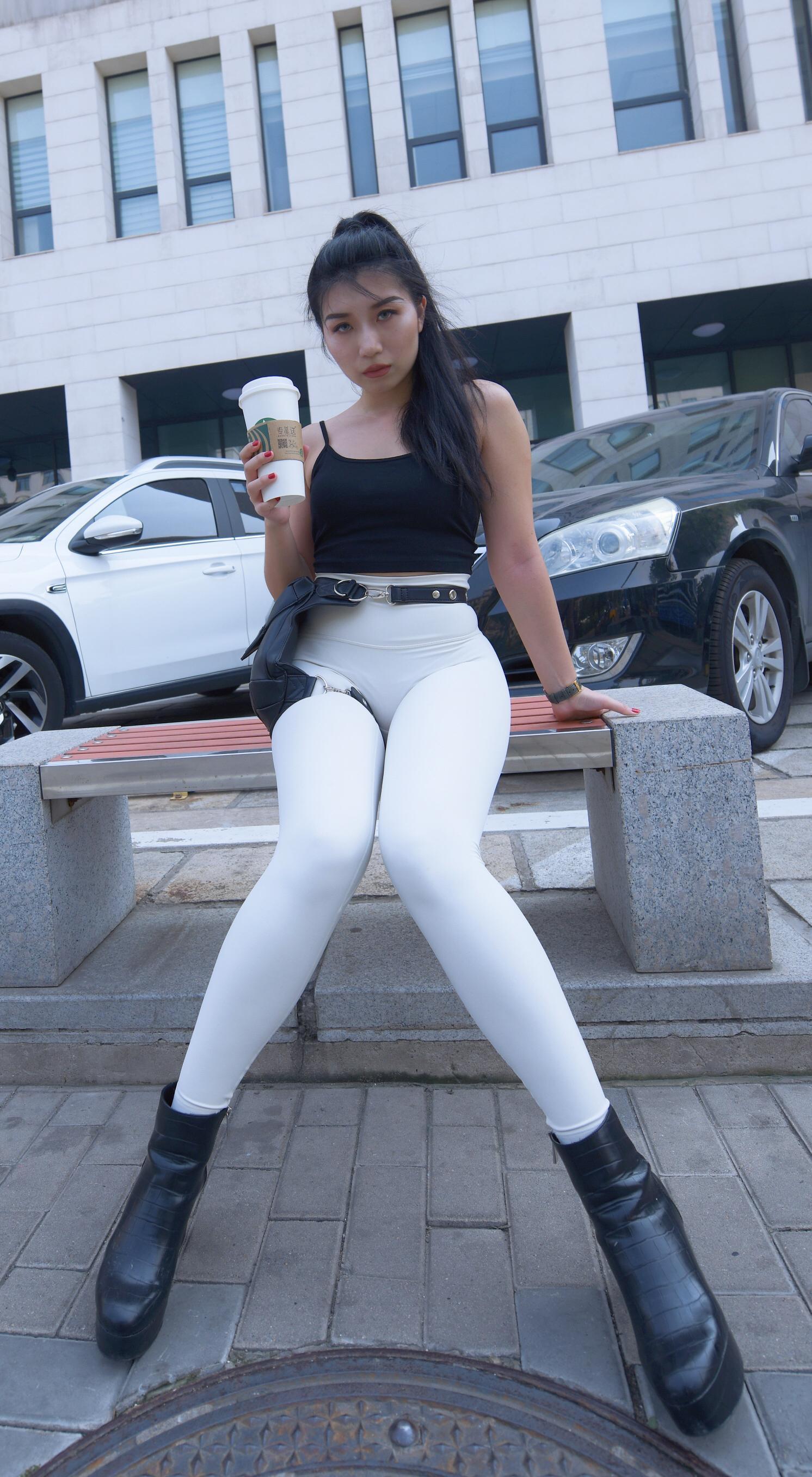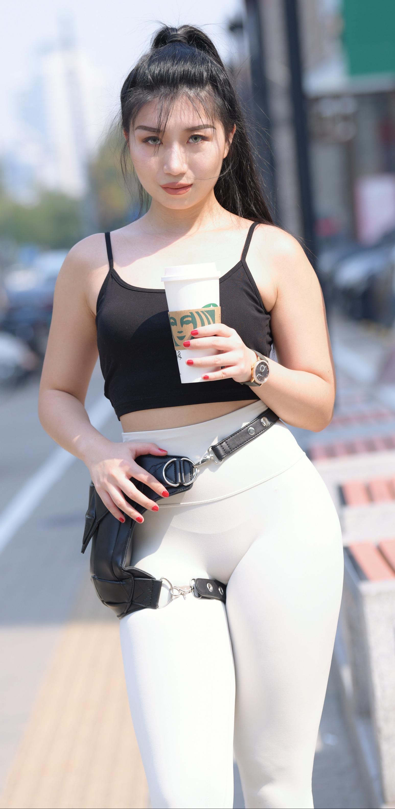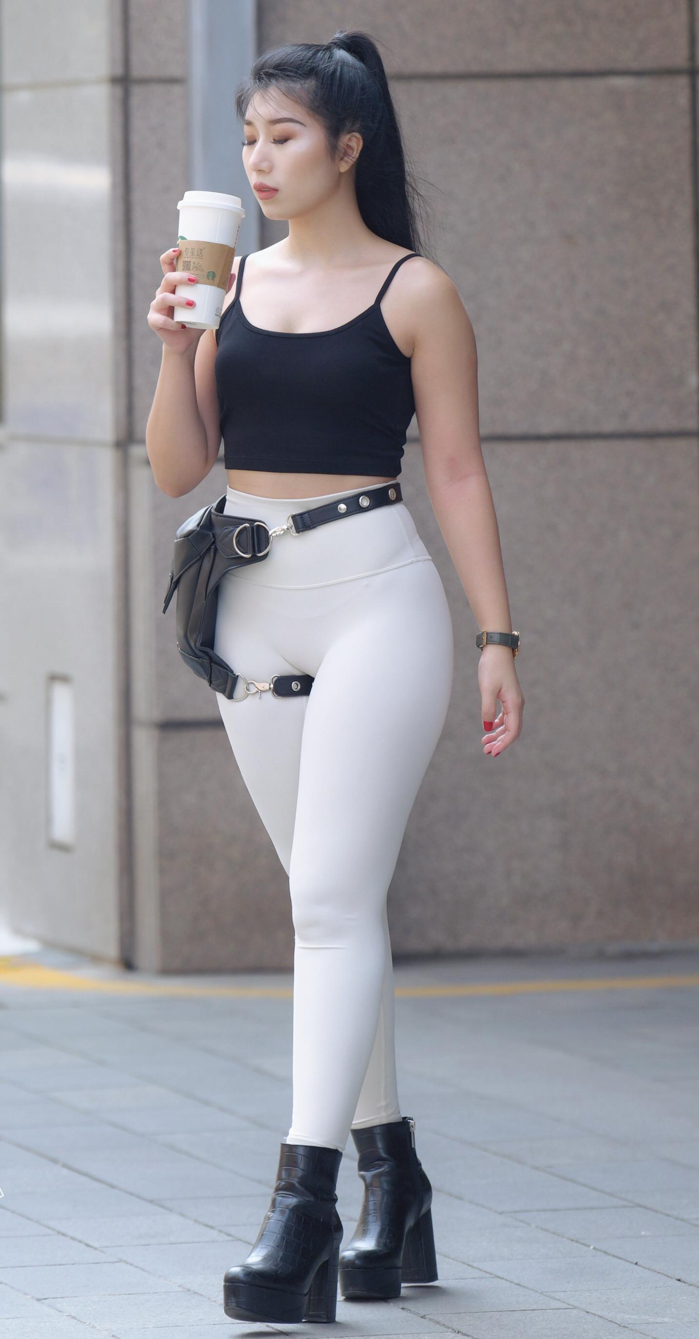 白色瑜伽褲搭配黑色吊帶背心,吸睛效果很強烈,走哪都是時尚焦點