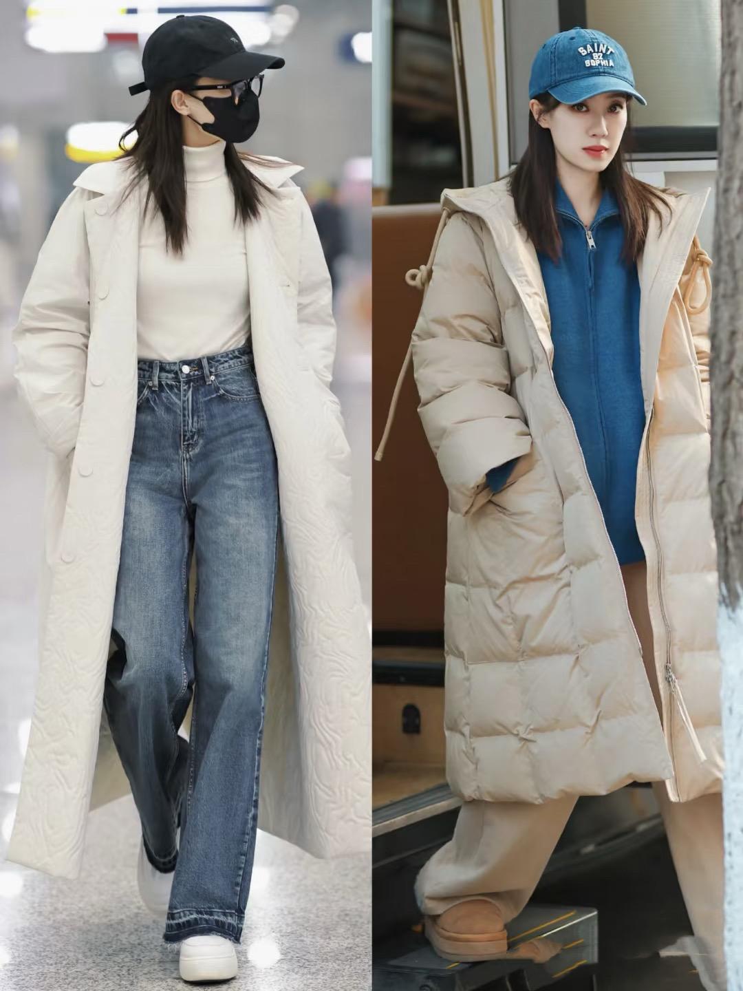 簡潔的H型羽絨服,連帽的款式很耐看。搭配直筒的高腰褲、顯得雙腿更筆直修長。這種米白色毛呢褲,配厚底雪地靴,也是超級保暖。