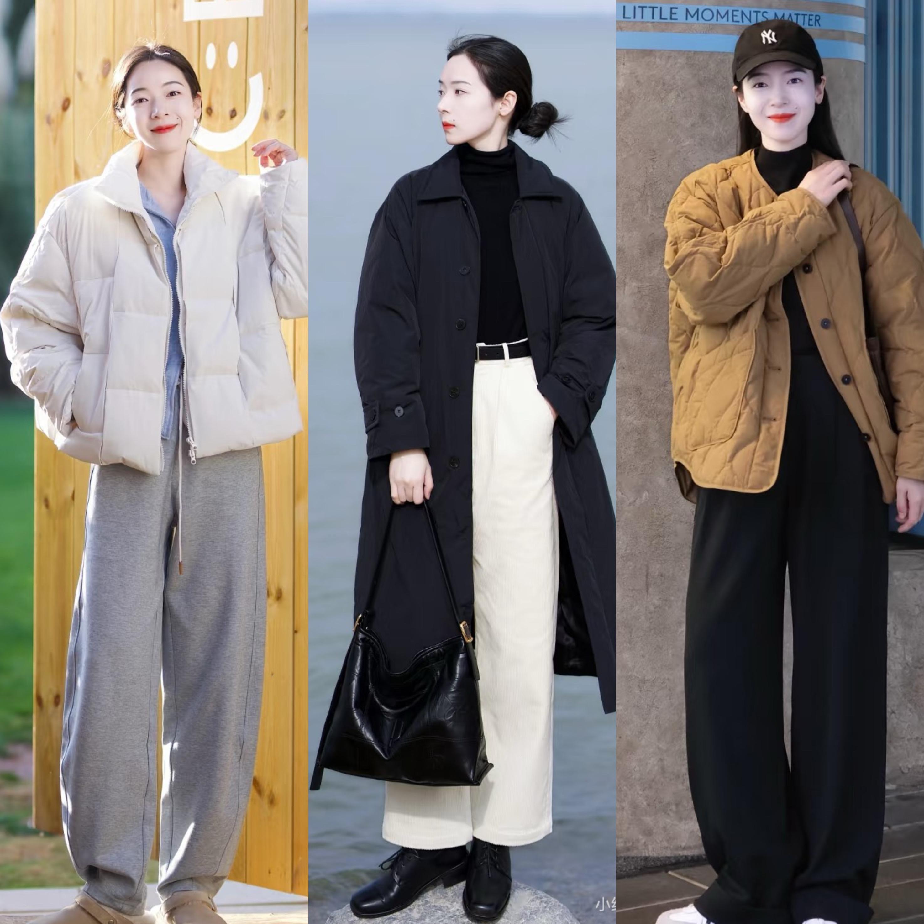 用短款羽絨服來搭配高腰闊腿褲,呈現出高級利落的美。高腰的闊腿褲,可以選擇加絨款式、或者厚實面料。厚實的高腰闊腿褲,配上厚底鞋格外顯腿長。