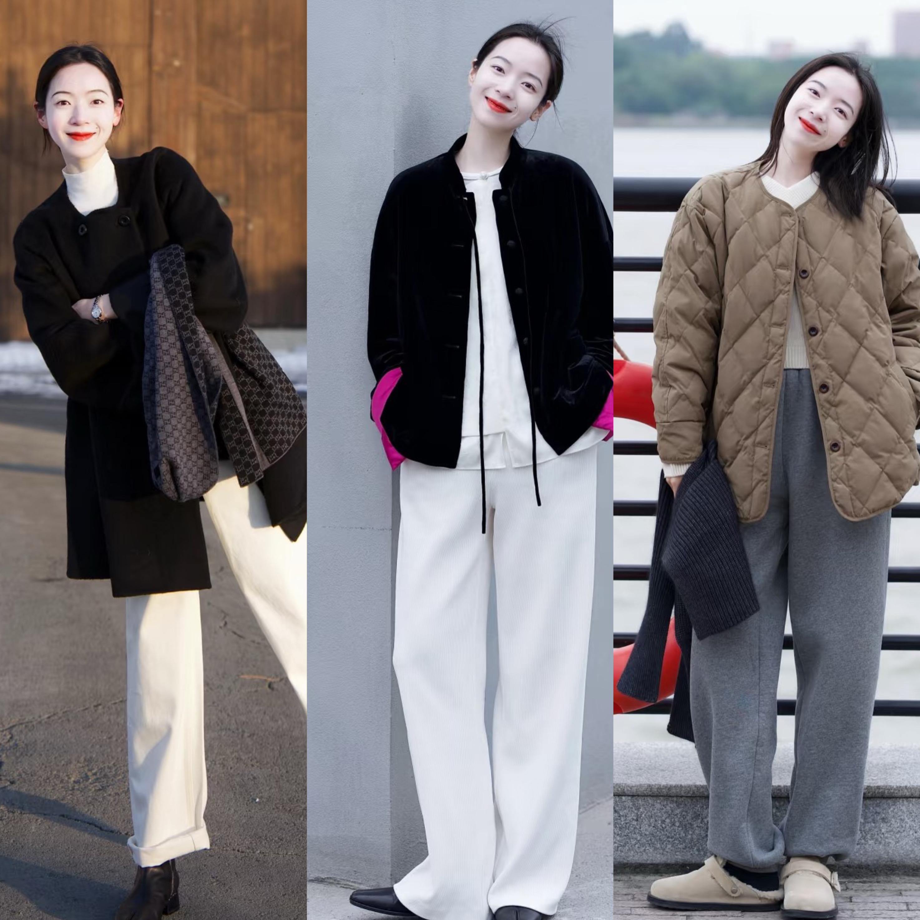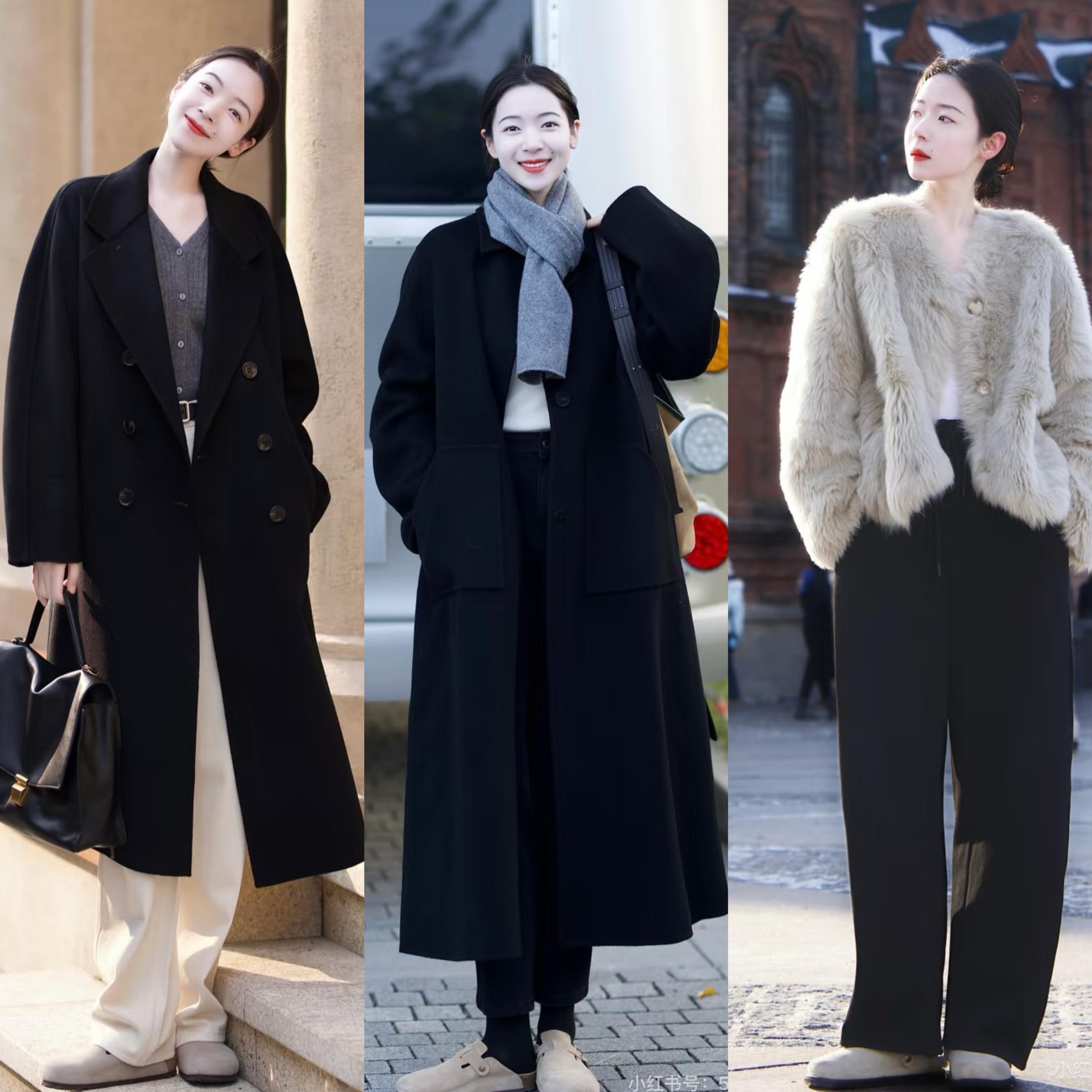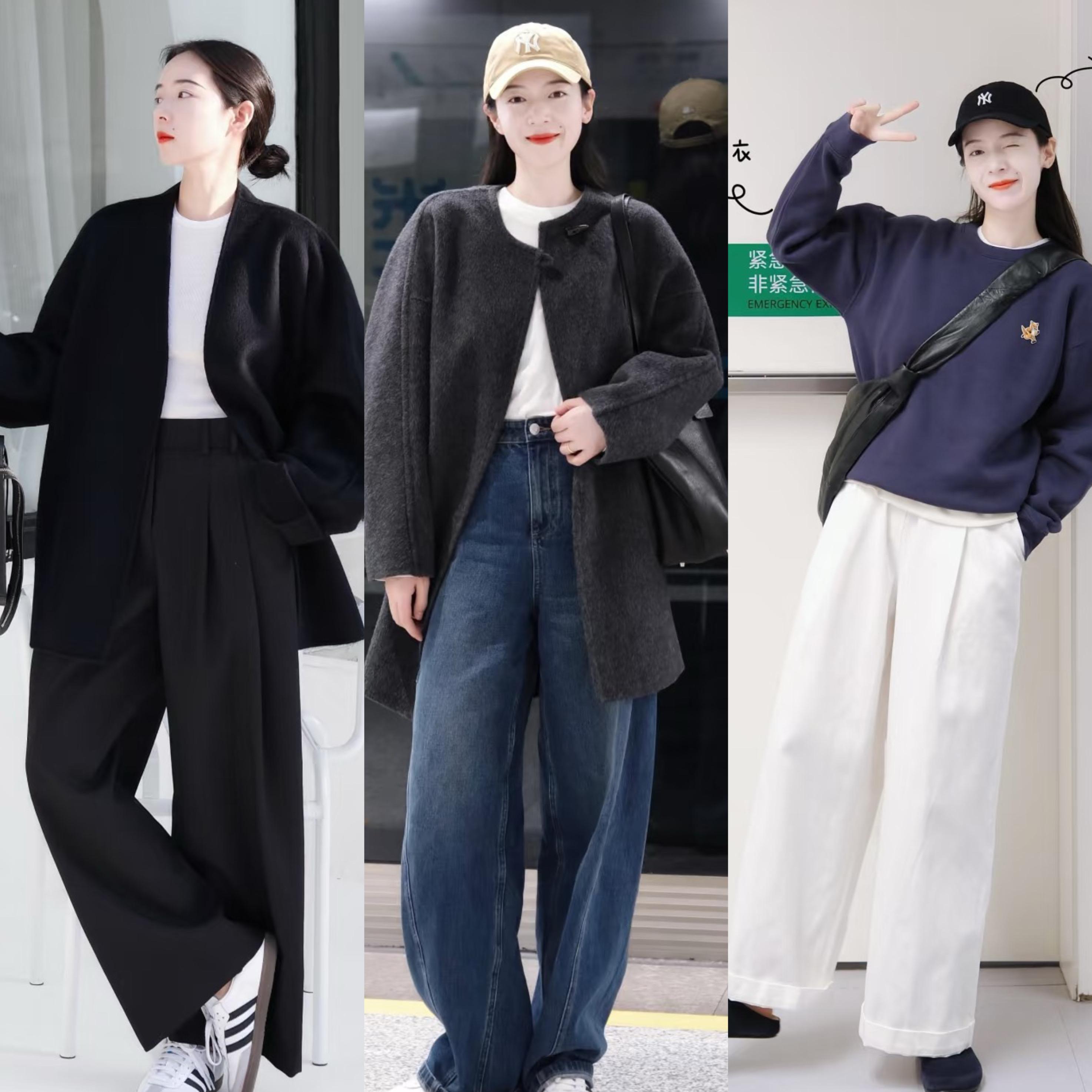 黑色大衣、外套、西裝褲。白色打底衫、鞋子、直筒褲,在她的穿搭裏都是日常且基礎的單品。