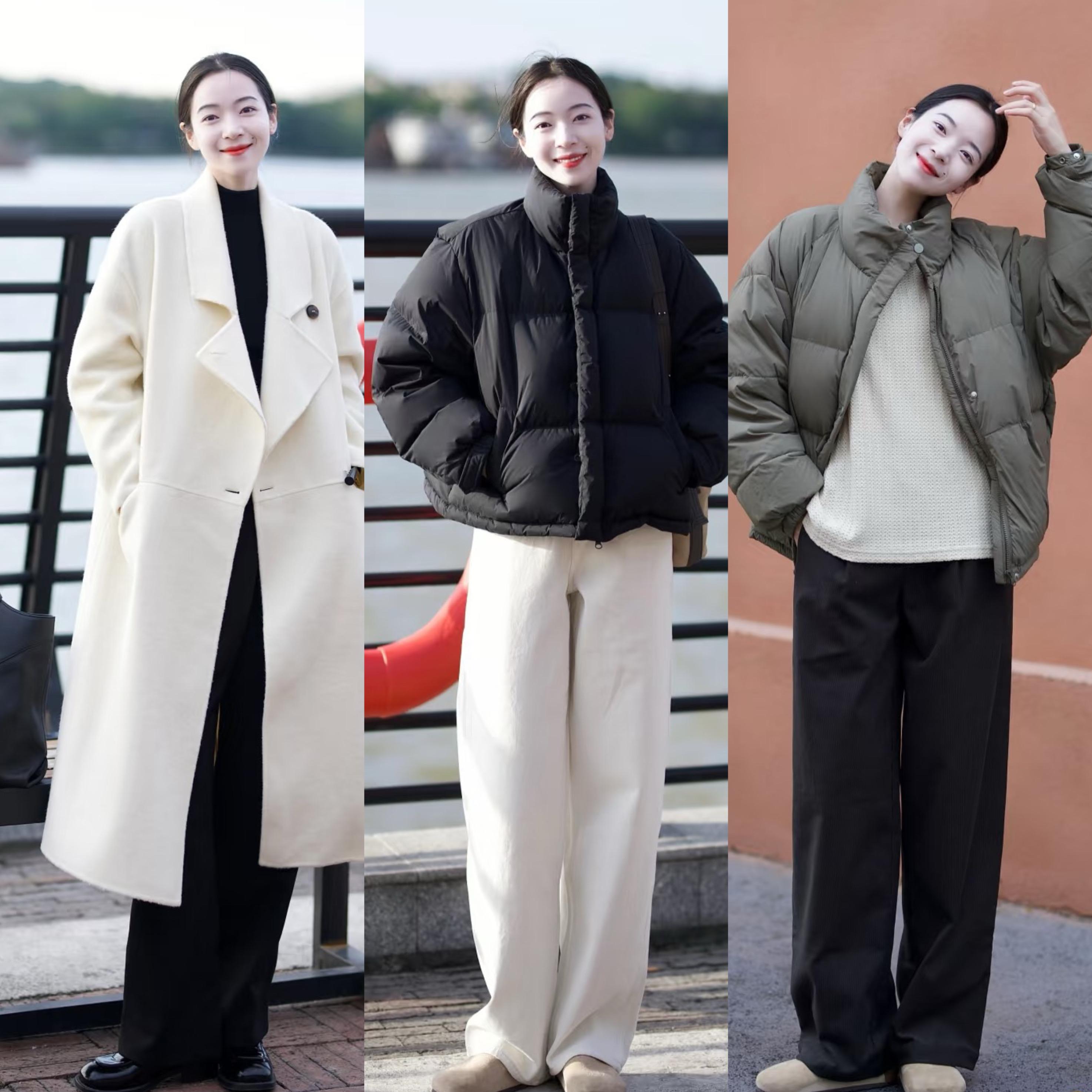 就像白色羽絨服+黑色半高領打底衫,就保暖又提氣質。黑色半高領打底衫+白色毛呢闊腿褲,顯高又利落,顯的雙腿超長、超大方。