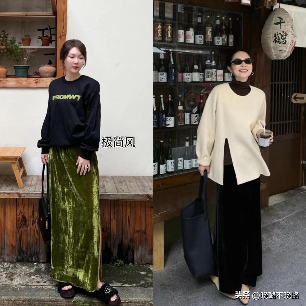 若你想要穿出慵懶隨性的氣息,那麼在搭配絲絨裙的時候,就不能錯過極簡風的上衣,比如圓領款式的衛衣、毛呢上衣、針織衫都很不錯,和絲絨裙的匹配度都很高。