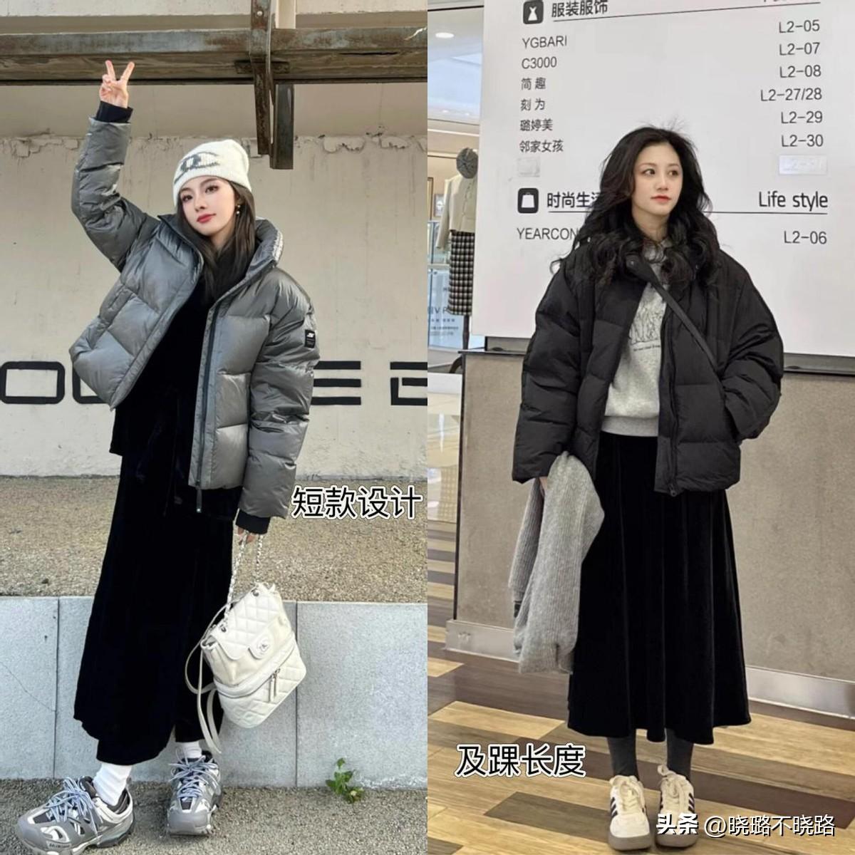 方針1.短款羽絨服+黑色絲絨長裙+運動鞋