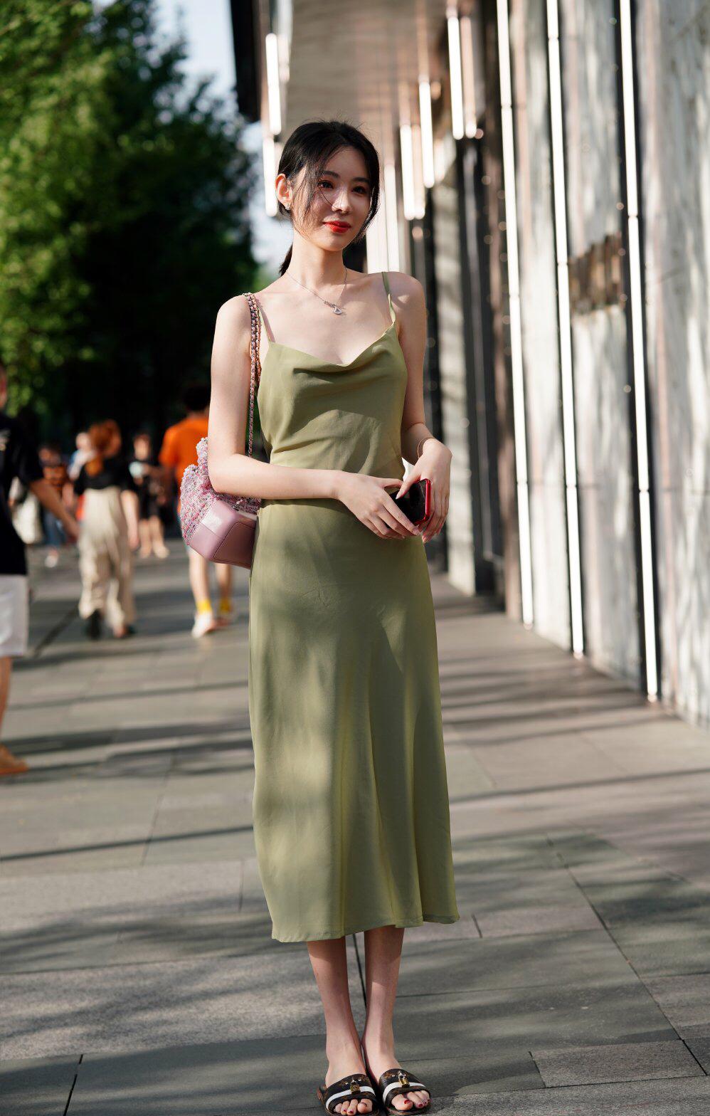 街拍:綠色吊帶長裙讓小姐姐顯得那麼清新淡雅