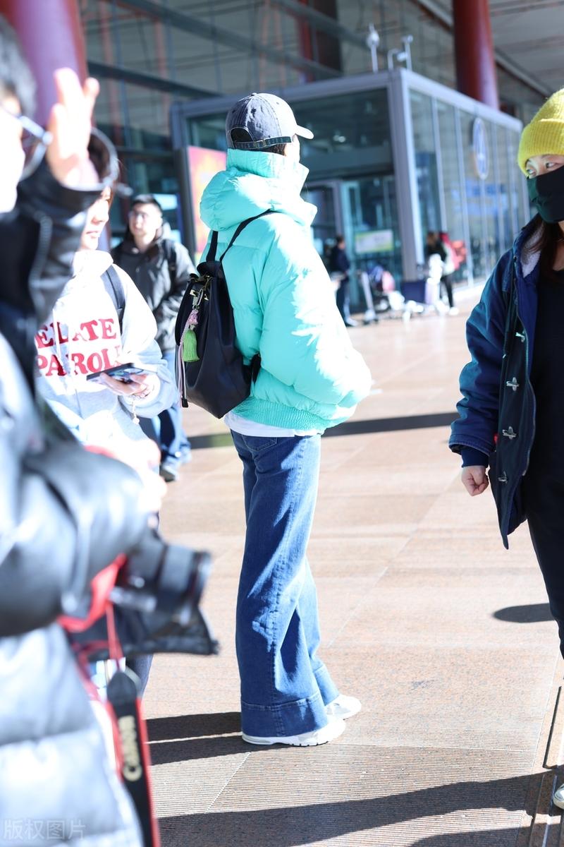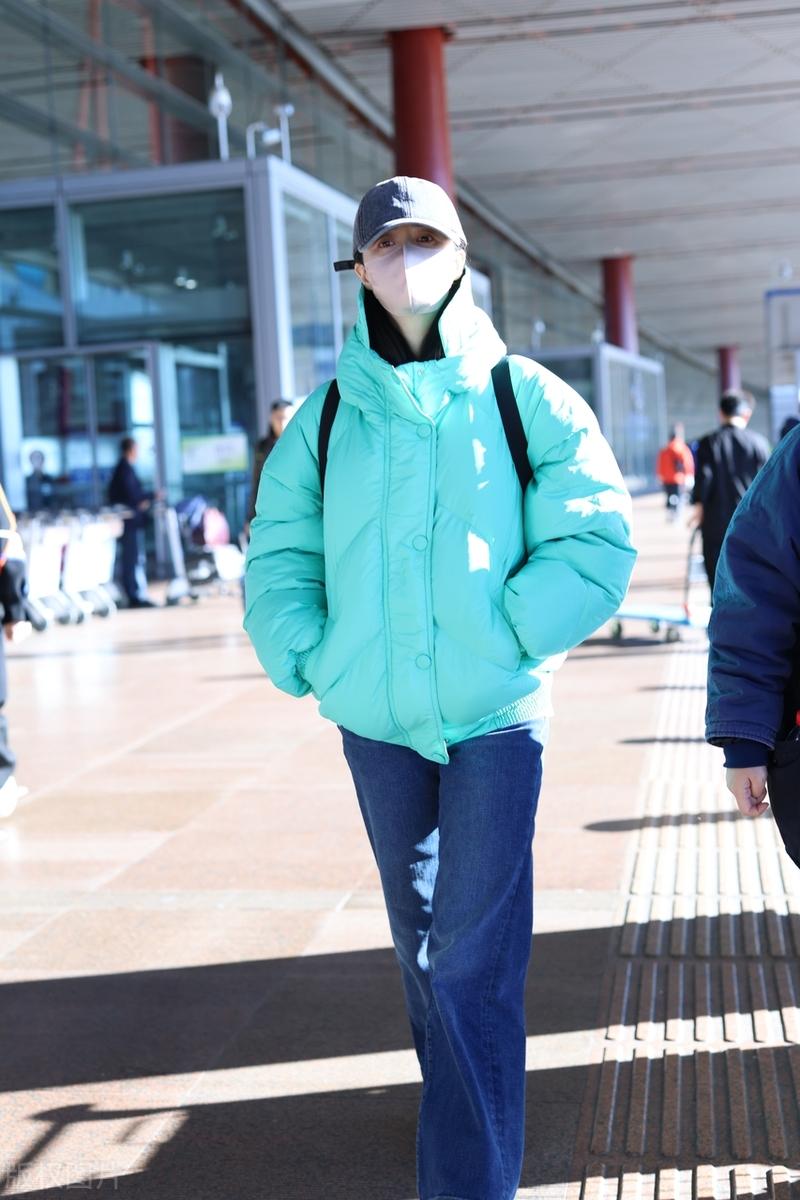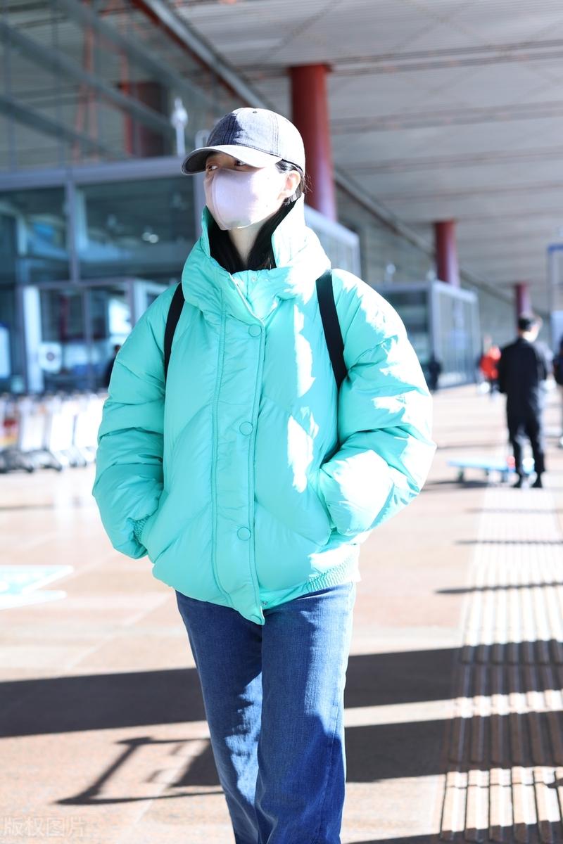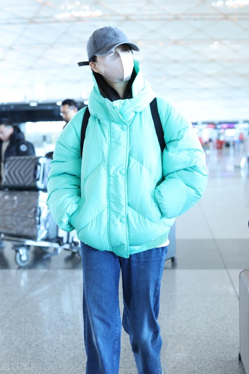 雖然蔣欣選擇了綠色羽絨服、藍色直筒牛仔褲的搭配。但是藍綠配色,視覺上很高級、也是一種特別協調的配色。讓簡潔的服裝,更自由的搭配,配色上也很關鍵。