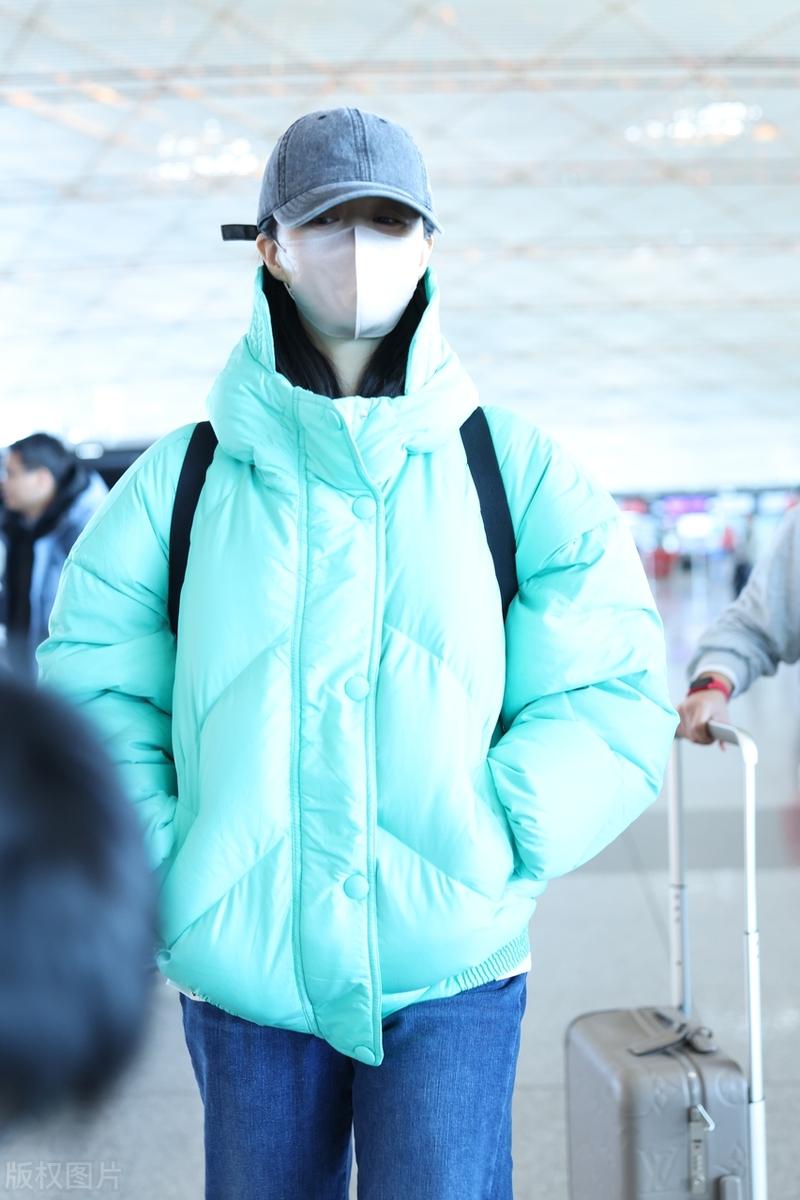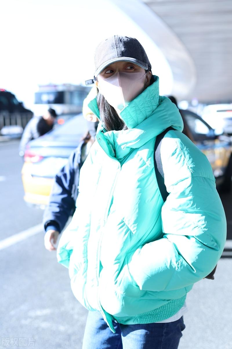蔣欣除了很大膽的選擇了綠色系,在羽絨服款式的選擇上也是別有新意。沒有選擇常規的H型羽絨服,以及相對中規中矩的款式。