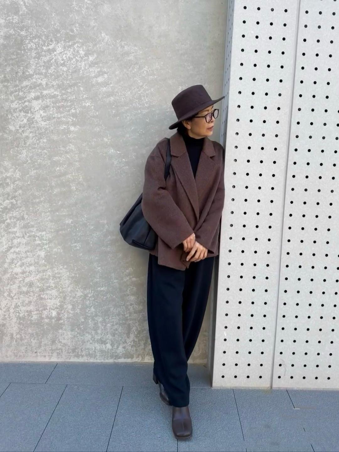 其實精緻的小禮帽,纔是這組穿搭的點睛之筆。這組美拉德與復古風撞擊的組合,真的很耐看、也很顯貴。