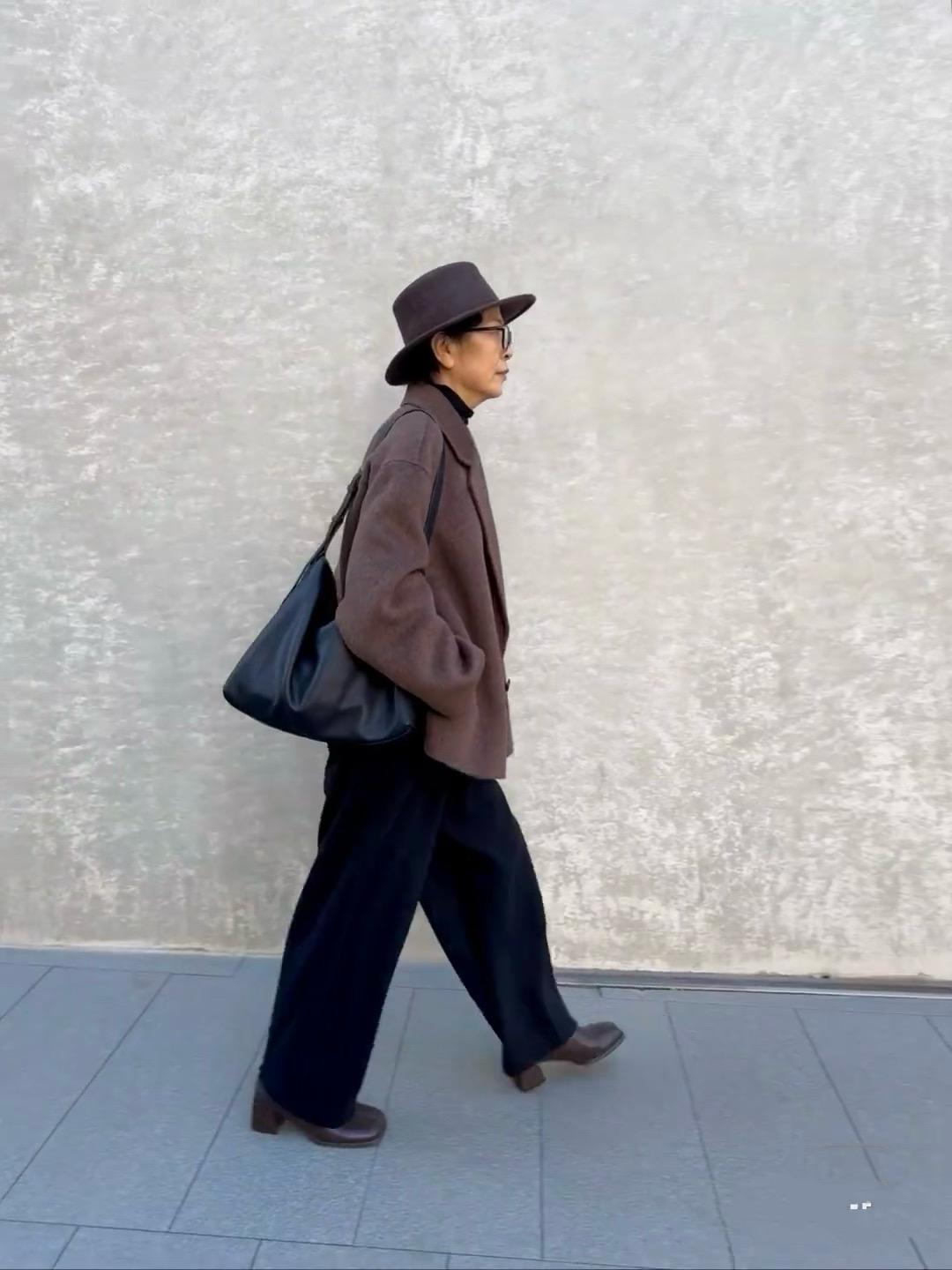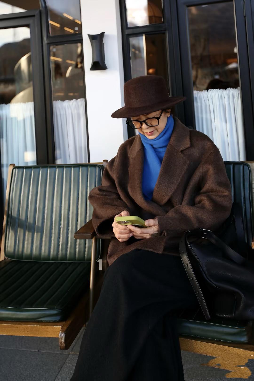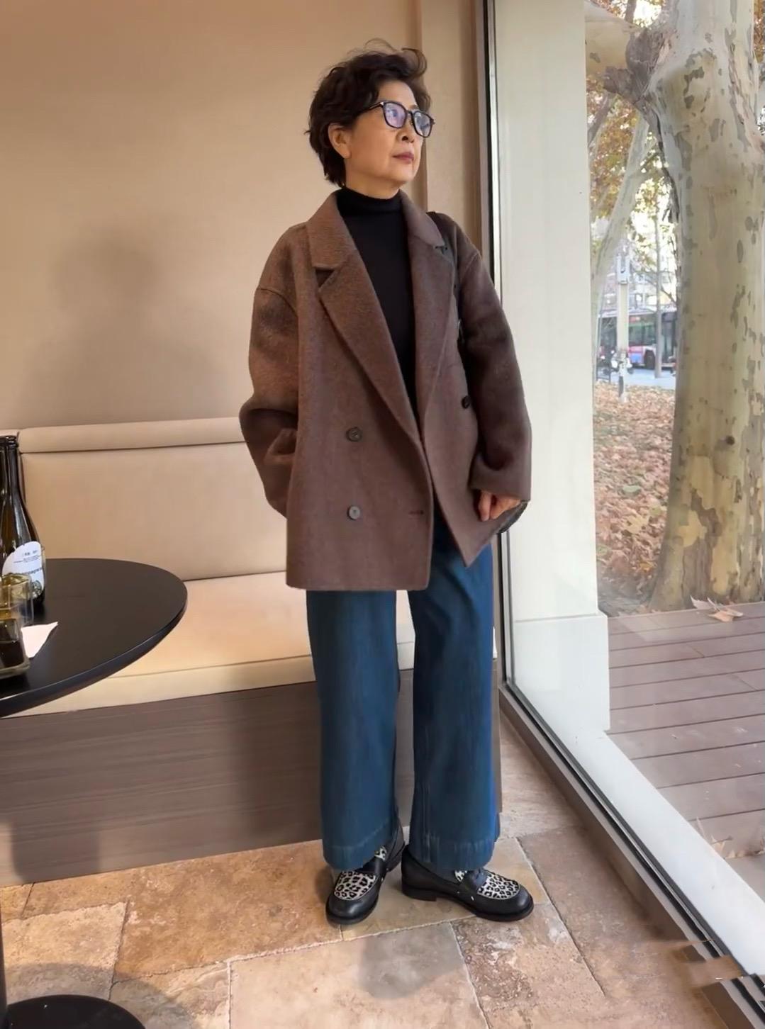 比如這種焦糖色的呢大衣,可以配寬鬆的闊腿褲。上了年紀,闊腿褲一定更有包容性,穿起來很大方、也不會邋遢顯腿粗。
